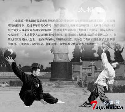 太极球功法是太极拳体系里一个重要的组成部分,是太极内功修炼的高层功夫,历代太极拳高手对此功法都是喜爱备至并且苦练不辍,长期以来其功法套路和秘诀承传隐秘、更是不肯轻易示人,如今能真正了解和掌握太极球功法的人寥寥无几。 长期以来,太极球功法被人为地披上了神秘的面纱,使许多太极拳爱好者可望而不可知,著名武术家安阳市殷都太极拳俱乐部总教练史晓明先生在传统太极球基础上,在太极理论的指导下,经过多年的苦心研习、领悟创编的太极球功法和套路,揭开了太极球的神秘面纱,《太极球》教学光盘一经推出倍受太极拳爱好者和专家的青睐,史晓明先生用最简练朴实的语言在中华文明的发祥地殷墟用90分钟时间向大家完整的讲述了《太极球》的基本功法和套路,使人一目了然。他的讲述使人顿开茅塞,他在中华文明的发祥地殷墟的演练,给人一种天人和一的美,给人一种气势磅礴的感觉,给人许多联想和启发。 史晓明先生演练的《太极球》在国内、国际太极拳交流比赛中,多次获个人表演和短器械类金牌,是目前国内太极球功法的重要传人之一。在第七回世界易经大会上,,他深厚的功力和娴熟的技艺,使参会代表真正感受到了太极拳形的飘逸,力的风采,健的英姿,神的韵味。被中外参会代表誉为“太极娇子”。 《中华武术》、《武林》、《少林与太极》、《中国新闻》、《安阳日报》、《香港商报》等杂志和《中央电视台》、《广东卫视台》、《河南卫视台》、《珠海电视台》、《山东电视台》《湖北电视台》、《太极网》、《博武网》等媒体都对他做了多次报道和评述。 为了完整的挖掘、研究、整理这套功法,近年来史晓明先生走了许多地方,拜访了很多名家高手,在传统太极球的基础上,在太极理论的指导下,根据健身性、欣赏性、普及性3条原则,创编了《太极球》、《太极鸳鸯球》、《双人太极球》3个套路和《太极球基本功法》,受到了海内外广大太极拳爱好者和专家的关注。