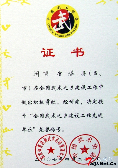 4月21日-26日,第六届全国武术之乡武术比赛在山东省郓城县召开,21日在全国“武术之乡”县长、体育局局长会议暨中国武术协会传统委员会会议上,温县被国家体育总局武术运动管理中心、中国武术协会授予“全国武术之乡建设工作先进单位”荣誉称号并颁发了荣誉证书。