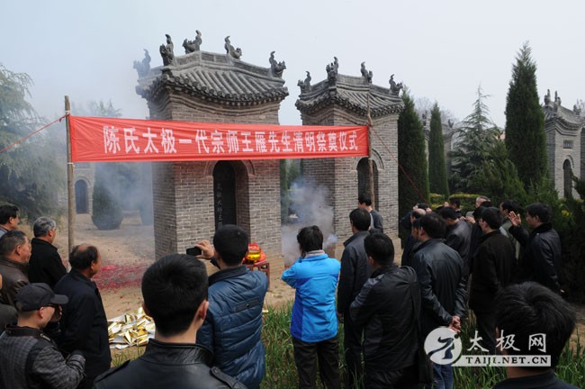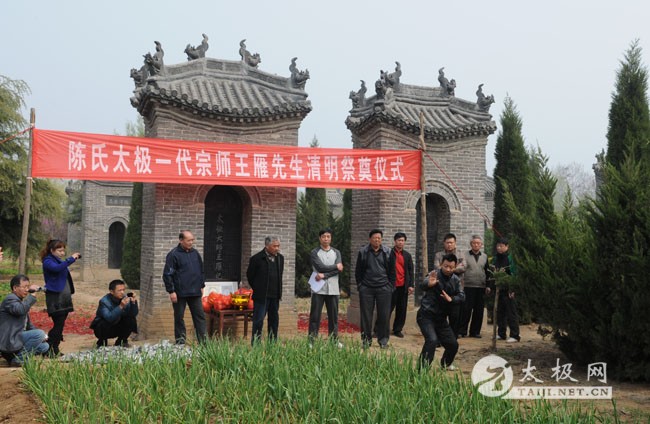 | 癸巳年3月31日,清明节到来前夕,来自新乡的陈金凤、李明江,焦作、洛阳、鹤壁等地的聂龙、采绪伦、郑永红等数十名太极拳传人,来到太极拳发源地温县,在太极大师朱老虎的带领下,为陈氏太极拳一代宗师王雁扫墓。 上午,在朱老虎家中,各地弟子借着难得机会,各自演练陈氏太极拳,让老师指点拳艺。11点,大家来到位于陈家沟太极拳祖林内的王雁纪念碑前,焚纸敬香,为王雁扫墓。在王雁墓前,弟子们纷纷演练太极拳,以此种方式表达陈氏太极拳先贤的敬畏之情,感恩之心。 王雁(1900-1980)字廷选,陈家沟人.师从于陈氏第八代传人陈延熙门下习学太极拳.与同门师兄陈宝璩、陈发科等为挚友.他练功刻苦,冬练三九,夏练三伏,拳艺大成.被后人称之为"铁捋"。上世纪50年代初,设帐授徒,1958年,陈照丕自郑州返故里,王摒弃武林旧习,让徒弟跟照丕学艺,不少徒弟两处求教,拳艺大进。晚年,将平生所学技艺倾囊授于外孙朱流群(老虎)和孙子长江。