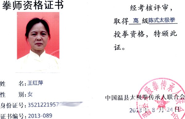 王红萍,女,1957年出生荣获陈式太极拳高级拳师资格证书