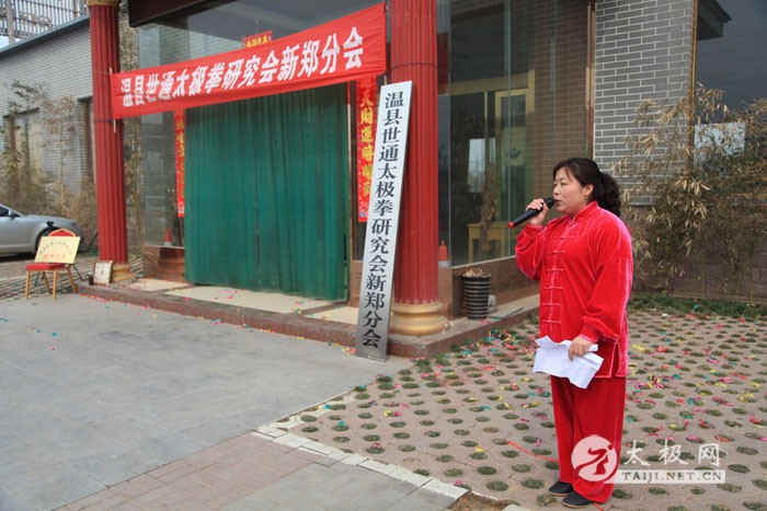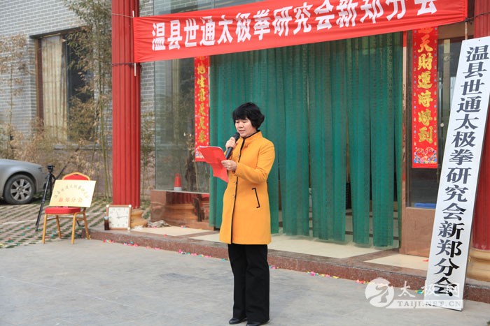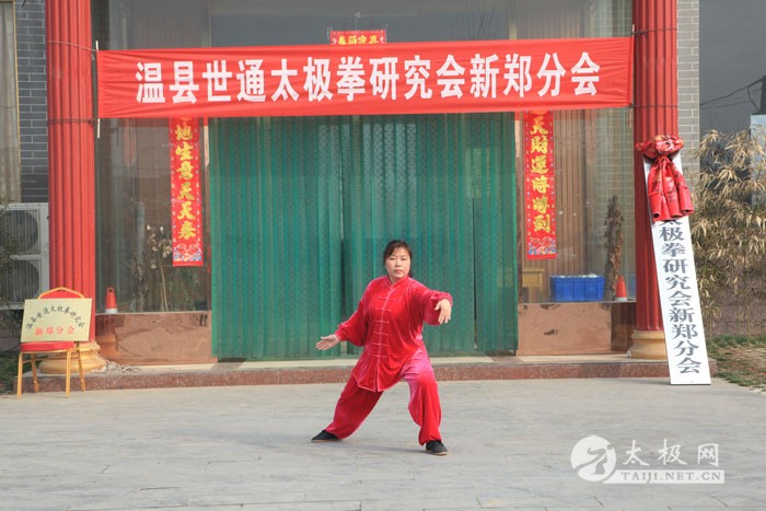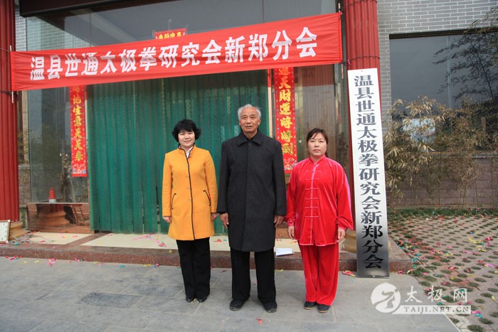 2014年3月2日上午,农历二月二,传说是龙抬头的日子,温县世通太极拳研究会新郑分会在新郑市隆馨生态园揭牌成立,新郑分会是在新郑市老拳师乔均喜先生的倡导下成立的。乔均喜出生于1949年,自幼喜爱武术,退休后更是将全部身心投入到了太极拳的传播和推广上,现任新郑市太极拳协会常务会长、温县世通太极拳研究会副会长、新郑市世通太极拳研究会分会会长、新郑市委老干部局轩辕太极队负责人及总教练,为新郑市的太极拳事业做出了很大贡献。温县世通太极拳研究会总会的领导陈世通大师之女陈军营、吴平利和太极网总编辑、温县太极拳传承人联欢会主席刘洪奇到场祝贺,新郑市太极拳协会会长敬红卫、新郑市人口计生委贾桂玲书记和部分新郑市的太极拳爱好者前来祝贺。揭牌仪式前,乔均喜的弟子和新郑市太极拳爱好者进行了精彩的太极拳表演,陈军营也应邀进行了传统陈家沟陈式太极拳的表演,赢得大家的热烈掌声。乔均喜老师最后为大家表演了陈式太极拳套路。
