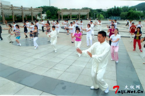 王国营带领学员练太极 浙江义乌鸡鸣山公园,每天清晨,都有一群身着练功服的人在一位年轻帅气的拳师带领下,习练陈式太极拳,他们动作飘逸,身法轻灵,常令到公园里的游客驻足观看,他们的拳式给人以一种美的享受,让人们情不自禁都会跟着比划起来。这位拳师就是来自太极拳发源地河南温县的陈式太极拳第十二代传人王国营。