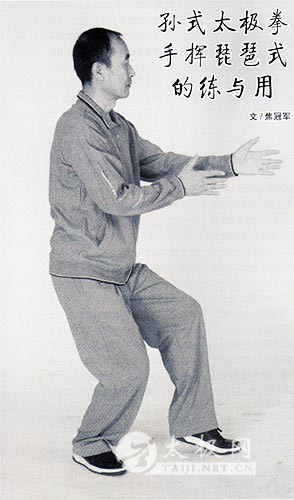 图1 手挥琵琶式的姿势要领: (以左式为例)左足在前,右足向后,身体重心在右足,左足足掌着地成虚步;左手在前,右手在后,两手与地面平行;左手五指伸直,虎口朝上,掌心向右向前平直伸出;右手虎口朝上,掌心向左,小臂平伸,肘尖靠肋,置于胸前;两手间横向相距约二寸许,右手指尖对左手腕纹线;两肘下垂;目视前方。 身体其它各部要求同于三体式,上体保持正直,头部虚领,胸部微含,腰部微塌,两腿微曲。周身放松(图1)。 手挥琵琶动作简练,可以直接和其它动作相承接。在孙式太极拳套路中它一般承接搂膝拗步、倒撵猴等动作。练习时要注意保持身体中正,不偏不倚,步法要与两手动作相协调,做到手到脚到,既要周身轻灵,又要劲整如一。 手挥琵琶式的用法: 对方用右拳击来,我略撤步,右掌接其腕,左手接其肘,顺势捋或撅(图2)。 图2 |