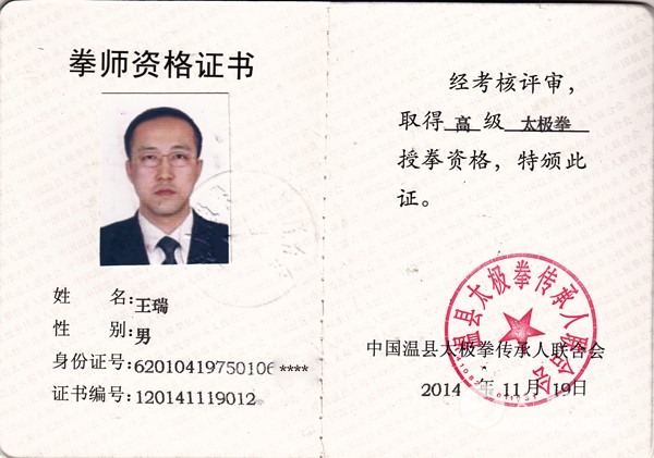 王瑞,男,1975年1月6日出生,2001年毕业兰州大学专业经济管理,研究生学历。自2002年在甘肃银监会工作至今,经济师。2005-2008年习练杨氏太极拳统编套路,2008年奥运宣传日甘肃省武术协会太极拳邀请赛上获得杨氏太极剑32式第二名。太极拳48式第二名。2008至今年师从刘建华师傅习练陈式太极拳。在2011年甘肃省武术协会举办的甘肃省太极拳邀请赛上获得陈式太极拳自选套路第三名,陈氏56式太极剑第三名。 2012年甘肃平凉崆峒杯传统武术锦标赛上获得陈式太极拳老架二路(炮锤)第二名,2014年全国首届武术运动会传统武术选拔赛上获得陈式太极拳自选套路二等奖,太极剑三等奖,2014年10月在武当山举办的杨氏太极拳高峰论坛武术展演会上获得陈式太极拳48式二等奖,太极剑三等奖。 本人兼职甘肃省太极拳协会副会长,兼甘肃省太极拳协会百合公园辅导站站长,武术4段,2014年10月8-9号通过武术五段理论、段位套路单练、对练,考试得分88.78分,五段正在审批中。2012年开始带学员共计40余人。本人现兼职甘肃省太极拳协会副会长百合公园辅导站站长。 2013年9月被聘为兰州银行、工商银行员工太极拳辅导员。 拳照 |