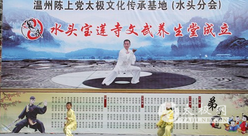 2014年12月7和8日,又两个陈式太极拳协会如雨后春笋,在温州地区破土而出。温州市陈上党的两个太极文化传承基地,相继在平阳县水头镇宝莲寺和苍南县钱库镇北岙村挂牌成立。 陈上党在宝莲寺太极拳基地庆典仪式上讲话 近年来,以陈式太极拳为主的太极拳传播热潮,在温州地区如火如荼,这把火的点燃和加油者,为温州市非物质文化遗产太极拳项目的传承人陈上党先生。 陈上党太极拳养生会所主教练徐金秀表演 教练苏雨涵 教练吴波 陈上党是我国著名太极拳传承人、国际太极拳大师王西安的弟子。多年来,他立足温州,辐射全国,积极开展太极拳的传播及国际性的交流,为温州地区以太极拳为主要内容的全民健身运动的开展和太极拳文化走向世界,做出了重要贡献。他在温州市许多县区,建立了近20个太极拳辅导站(基地),受益者达三万多人。 “铁腿”陈永辉 掌王林一 遍地的太极拳之花,使陈上党的名字在温州和太极拳紧紧地联系在一起。 7日上午,宝莲寺陈上党太极拳文化传承基地暨宝莲寺文武养生堂在平阳县水头镇宝莲寺成立。之所以选定这个地址,因为宝莲寺是当地香火旺盛的一所寺院,人气旺盛。寺院主持智法大师喜欢太极拳,看重中国太极拳传统文化和禅文化结合对人们修心养性、陶冶情操的重要作用。他和到这里修禅考察的陈上党一拍即合,在一个月的筹备时间内,报名参加基地太极拳学习的就达100多人,促成了宝莲寺文武养生堂的成立。 少儿太极拳表演 学员雷正海 苍南,是温州地区的武术之乡,太极拳文化在这里有着广泛的传播基础,在陈上党及其弟子的影响下,苍南县钱库镇热爱太极拳的人群剧增,200多名太极拳爱好者,在当地李上蛟先生的带领下,积极组织了这次钱库镇合作太极拳协会的成立庆典,使陈上党的太极拳传承在温州市又多了一个基地。 龙湾基地太极拳学员 水头镇太极拳学员表演 温州市陈上党陈式太极拳养生会所的学员和从外地赶来义助庆贺的嘉宾,分别为这两个基地的成立,献上了一台精彩的演出。 苍南县钱库镇授牌 行云流水中突发刚猛气势的陈式太极拳的拳械表演,使当地群众耳目一新,真正领略了太极拳的大气磅礴与飘逸柔美,一扫过去对太极拳“摸鱼”“舞蹈”的错误认识。一些人当场打听,要报名参加太极拳学习。 参加钱库镇表演的主要演员和嘉宾 这两次活动,更加助推了温州地区太极拳活动的开展。 |