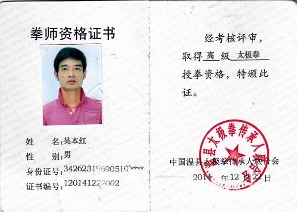 吴畏,字本红,太极轩主人,安徽省芜湖市无为县人。自幼随民间拳师习少林连手短打、少林八步连环拳和梅花拳。92年从学于安徽合肥著名拳师王华胜先生习九节鞭、昆仑剑、陈式太极拳。94年从学于全国陈式太极拳名家马虹先生,在马虹老师的严格传授下,其拳架规范工整,拳路劲法明晰,松紧有度,拳姿雅静大方。又多次去江苏徐州求艺,得到陈氏洪派太极拳名家蒋家骏先生指导,在蒋师处,较为规范的掌握了洪钧生先生的正、反圈太极缠丝法,及腰裆功的训练方法。后从师于河南温县赵堡镇太极拳技击大师和定乾先生,专心研悉和式家传太极拳、械、打手、散手技艺。其善研技理,广采博览,涉猎心意、武当等诸家拳法刻苦习练,功架纯正,对太极拳理法有独特见解。 92年至今,为求真艺,先生曾先后多次至合肥、石家庄、苏州、上海、马鞍山、徐州、河南温县赵堡镇等地寻师访友,又延师至家中专心求教,在恩师的悉心指导下,他渐探太极门径,将其所学所悟草拟成文,先后在《中华武术》、《武林》、《少林与太极》等武术杂志上发表了论文十余篇,其《劲由“松”中求》、《动态中整劲的求取》、《太极拳单操手的练法与用法》等文章得到国内外同道一致好评,来电来信交流络绎不绝,多次在家中接待外地来访者,并应邀至深圳、铜陵、巢湖等地传授太极拳。直接传授学员逾百人,多次应邀参加社会各类武术活动,所表演的拳艺,得到与会者的一致好评,其门下弟子、学员在各类比赛活动中均取得优异成绩。在当地首次倡议成立了无为县太极拳协会,并被推选为第一任会长,曾担任巢湖市武术协会副主席、巢湖市太极拳协会技术顾问、现为中国武术协会会员、国家武术五段、国家一级社会体育指导员、国家武术二级裁判员、致中和太极拳社社长兼总教练、和式太极拳第七代传人。 拳照 |