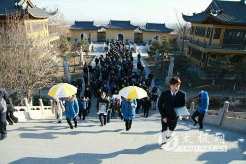 2014年12月21日上午,著名国际太极拳大师马虹先生的骨灰安葬仪式在石家庄龙凤苑举行。马虹先生的亲属和专程从新疆、吉林、香港等全国各地赶来的弟子共200多人参加了仪式。 天空祥云,龙凤呈祥 马虹先生生于1927年, 2013年12月22日逝世,享年86岁。这对于40多岁时提着暖水瓶上三楼还要休息两次的马老来说,是太极拳创造了他的生命奇迹。 这天,石家庄难得的晴空丽日,在蓝天中阳光的照射下,龙凤苑显得肃穆庄严。这是石家庄市依山傍水而建的一座公墓。青松翠柏中,一排排安静的墓碑依山排列,马虹大师的骨灰将安葬于凤山阳坡较为中间的位置。 骨灰安葬仪式前,众弟子在寒风中列队,迎接恩师的骨灰,并含泪呼唤着师父。公墓大殿前,简短而又隆重的追思祭奠仪式后,200多名弟子,在沿山而上的台阶间的三个大平台上,集体表演太极拳告慰师父,然后行跪拜大礼为师父送行。 北风呜咽,百鸟闭鸣,送葬的人群手捧傲霜抗寒的菊花,在“师父!走好!”深情而悲切的呼唤中,缓步拾阶而上,将马虹先生送到了他永久安归的福地。 或许天意,也许巧合。是日,石家庄上空,天难得的湛蓝湛蓝,仪式举行前,天空丝云不挂,直到安葬马虹先生骨灰的时刻,天空出现了片朵白云。骨灰安葬后,几朵白云在太阳旁一左一右,短时间呈现出了龙凤形状。这奇异的天象,令所有在场的人仰天惊喜,他们认为,是师父的德风感动了长天,给了今天的好天气,并在龙凤山上空呈现了龙凤呈祥的天象。 为纪念马虹先生逝世一周年,他的弟子们经过3个月的紧张准备,编辑出版的《为而不争著华章》一书,当日与大家见面。这本书登载了马老的弟子们回忆与恩师相处并深得恩诲的文章,讴歌了这位格外令人尊敬的老人及他所留下的在太极拳界有着很大启迪意义的“马虹精神”。河北省、石家庄市的有关领导及一些知名人士,为本书题词;原温县体育局局长、中国国际太极拳网总编原福全和现任温县体育局长宋明军,分别为本书作序,回忆、总结和评价了马虹先生令人敬仰的一生及其精神。 仪式结束后,在马虹先生家属举行的答谢宴会上,师母告诫众弟子,要遵循马虹先生生前的教导,“练拳练心练人格,教拳交心交朋友”,把太极拳文化传承好,造福人民。 通过参加本次仪式,记者又一次目睹了马虹先生教导出的弟子们的团结友爱的品德与高尚文明的素质,体会到了他们所弘扬传承的马虹精神。 |