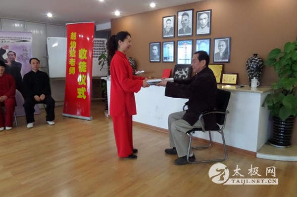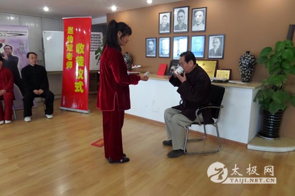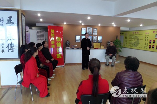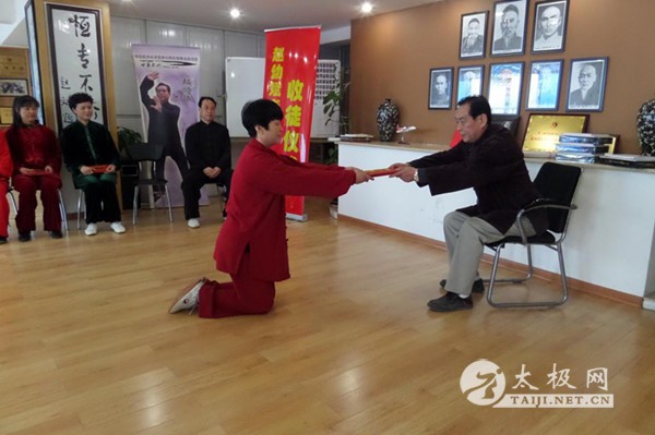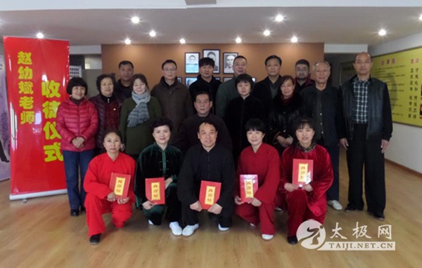 |     近日,太极大师赵幼斌在西安武馆举行收徒仪式,接收5位学生为弟子,这5位新科弟子均来自陕西省大荔县,分别是王润智、兰菊花、于安玲、杨娟萍、裴红芹。     收徒仪式由赵幼斌弟子顾赟主持,赵幼斌大师率领全体人员向杨式太极拳宗师像行鞠躬礼;宣布师门诫规;新科弟子一一介绍个人情况并向赵幼斌大师呈递拜师帖、行拜师礼;赵幼斌大师作了深切的讲话,提出了严格要求并寄予厚望。     赵幼斌弟子邢宝忠代表老弟子讲话,对新弟子表示欢迎和恭贺;王润智代表新弟子做表态发言;随后进行了各层面的照相留念。赵幼斌大师20余位西安弟子参加并见证了这次收徒仪式。 |