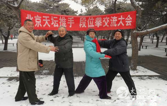 “风雨送春归,飞雪迎春到,已是悬崖百丈冰,犹有花枝俏。”2015年2月28日,北京城从早晨到中午纷纷扬扬的大雪。大家欢呼,大家雀跃;瑞雪呀!好雪呀!然而,中国武协市场开发委员会委员陈延军先生却有些惆怅,心存疑虑,他担心雪后气温骤然下降,太冷了,道路结冰,湿滑难行影响交通。加上春节期间很多家在外地的武友尚未回京。这样的情况,推手大会还能不能正常举行?然而热爱武术推手运动的陈延军先生不管有多少困难,争取做到风雪无阻,如期将《北京天坛推手段位拳交流大会》横幅挂在天坛公园。今日下雪使天坛公园游人明显减少,往日在公园的武术习练者今日也不见踪影。但是,北京市包银律师武术协会副主席马继英,意拳名家李平德、粱宝全,推手爱好者柴先生以及一些不知道名字的武友们如期来到了大会现场。京城推手名家陈忠福也冒雪赶往现场……
