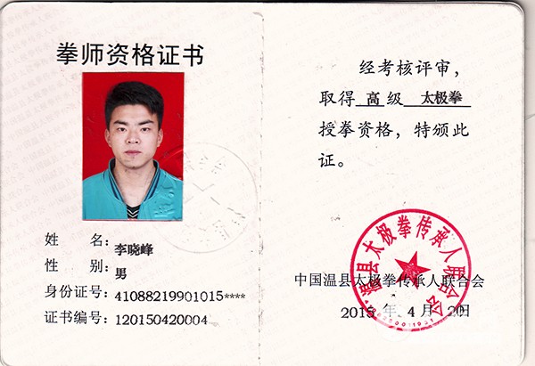 1990年生于河南焦作沁阳,陈式太极拳第十一代传人,全国武术太极拳锦标赛冠军,国家一级拳师、一级武术裁判、一级武术教练员,国际太极拳传播大使,中国武术六段,中国武术协会会员,温县陈家沟武术院教练,泉州石狮武术协会教练,甘肃金昌武术协会副会长,沁阳武术协会副会长, 焦作太极中等专业学校客座教授, 获得太极拳名师的称号,现任河南省沁阳市晓峰养生太极武馆馆长兼总教练。2004年跟随国际太极拳大师王西安高徒 庞继安 宗建贵老师学习太极拳武术套路 器械 推手,并得到国际大师王西安 陈小旺 王战军老师的悉心指导,之后拜陈家沟陈氏十八世太极拳第十代正宗传人陈长虹为师学习太极推手秘诀 实战技巧和内功修炼 。曾在福建 甘肃 南京 陕西 北京 辽宁 郑州 焦作 等地教学授艺,经常与国内外的武术爱好者进行切磋交流,被多家电台、报纸等媒体采访报道。其待人真诚,为人直爽,因人而异的教学方法为陈氏太极拳的弘扬发展和走向世界作出了贡献。 2004年8月,参加在中国温县举办的“河南省陈家沟武术锦标赛”荣获太极拳一等奖 太极剑一等奖。 2005年9月,参加在焦作市温县举办的“三零杯”中国陈家沟传统太极拳邀请赛”荣获太极拳第一名 太极剑第一名 2007年5月 参加中国焦作市第十一届运动会 荣获传统太极拳冠军 2007年参加“天香面业杯”中国陈家沟太极拳邀请赛 获得太极拳 太极剑第一名。 2009年8月举办的 第五届中国 焦作(国际)太极拳交流大赛 荣获陈式太极拳传统套路第一名 太极剑第一名 2010年7月 在福建泉州举办的 “法影杯”2010年南少林华夏武术大赛 荣获陈式太极拳冠军 2011年9月参加南京武术协会成立典礼 被评为南京武术协会一级教练员 荣获南京三好市民 2011年8月举办的 第六届中国 焦作(国际)太极拳交流大赛 荣获陈式太极拳传统套路第一名 太极剑第一名 2011年10月在河南省沁阳市举办的沁阳市首届“上林苑杯”太极拳比赛大会 荣获太极拳第一名 太极剑第一名 团体太极拳比赛一等奖。 2012年8月被河南省沁阳市市委宣传部 评(晓峰养生太极武馆)为 “文化志愿活动先进团体” 2012年 被中共沁阳市市委被评为2013年度春节民间艺术汇演优秀节目 一等奖 2013年 参加第七届中国 焦作(国际)太极拳交流大赛 荣获陈式太极拳传统套路第一名 太极剑第一名 晓峰养生太极武馆荣获金牌28 枚 银牌 25枚 铜牌16 枚 团体第一名 2014年8月参加中国陈家沟陈式太极拳国际交流大赛荣获 19 金 28 银 15 铜 团体第一名 2014年9月参加甘肃省省运会武术套路比赛 荣获陈式太极拳套路第一名 太极剑 第一名 2014年9月参加沁阳首届 《我型我秀》才艺表演 集体荣获第二名。 2014年 被河南沁阳《职教中心 》,《实验小学》 , 聘为太极拳武术教练。 李晓峰拳照 |