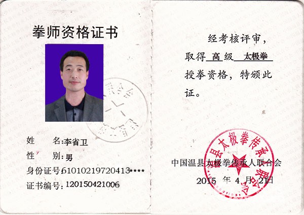 | 陕西省西安市人,武术五段,陈式太极拳第十二代传人。自幼热爱武术,多年来由于自己勤奋好学和自己的坚持不懈,能熟练掌握陈式太极拳的各种套路和推手擒拿等技术, 2007拜西安陈式太极拳小架著名传人陈献忠大师为师。曾多次在陕西举办的省、市、区的太极拳比赛中,都取得过优异成绩。近年来,还多次到温县陈家沟太极拳小架著名传人陈伯祥家里拜师学艺,不断地和他的师兄弟交流拳术,提升自己。他感到太极拳文化的深奥,觉得自己有传承的责任和义务。 李省卫拳照 |