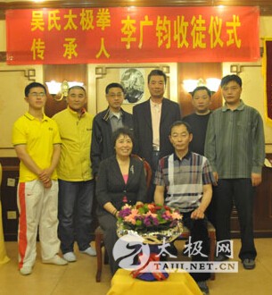 2015年5月10日,吴式太极拳第五代传人李广钧先生收徒仪式举行。李先生同门、亲友及武术界友人50余人共同见证。仪式简约而又隆重。 出席李先生收徒仪式的有中国式摔跤和大成拳名家梁宝全先生,北京吴式太极拳研究会理事赵茂华先生,吴式太极拳传人姜寿平先生等。李广钧先生此前共收过3次徒,有7名入室弟子。此次,王军、李自立、侯广东、高延斌、丁景宇、赵俊等6名新弟子按照传统仪式拜在李先生门下。吴式太极拳韩秀峰先生支派门户壮大,增添了新生力量。梁宝全、赵茂华和李广钧先生同门及亲友相继发言,对他喜收新徒表示衷心的祝贺,希望在他们师徒的共同努力下,将吴式太极拳韩秀峰一支发扬光大。李先生的老弟子希望新入门的师弟们勤学苦练,德艺双修。新弟子们表示一定不辜负大家的期望,苦练精研,回报师恩。李广钧先生表示,一定会悉心授徒,毫不保留地将传统技艺原汁原味地传承下去,为传承、发扬吴式太极拳做出应有的贡献。 李广钧,1958年出生于北京,1988年随杨式太极拳名家崔毅士先生的学生王书眉先生学习杨式太极拳。他尊师重道,刻苦练功,深得王先生喜爱。王先生文化程度高,善于总结拳理、拳法,创编了很多拳法歌诀,生动活泼,言简意赅,内涵深厚。他将《太极拳式解析》等歌诀全部授予李广钧。李广钧于1992年又拜吴式太极拳第四代传人曹希年先生为师。曹希年先生师承于“太极五虎将”之一韩秀峰先生。韩秀峰先生是吴式太极拳一代宗师王茂斋先生高徒,功力深厚,但传人极少,外界知其名者虽众,能见其艺者甚少。李广钧有缘入曹师门下后,系统修习流传稀少、风格独特的韩秀峰一支传统83式吴式太极拳,是当代此支拳法的代表人物。近年来,他以歌诀的形式总结、整理出很多盘拳心得,颇有新意。