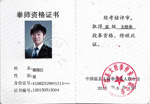 毕业于北京体育大学武术学院 太极专业 电话:18612201201 专业:民族传统体育专业(武术太极拳) 教育背景 2009.09 – 2013.07 北京体育大学武术学院 本科 2006.09 – 2009.07 陈家沟武术学院职业中专 中专 2004.09 – 2008.07 河南省陈家沟武术学院 初中 个人主要成绩 2013年获得考取段位培训员和段位考评员 2012年北京体育大学首届竞艺大赛中夺武术情景剧《和平之战》夺得 第一名 2012年在香港武术节武术套路比赛中(对练)获男子对练 第一名 2011年第六届国际太极拳年会获得太极剑一等奖,国际规定拳第二名 2010年北京体育大学武术套路比赛中获男子太极拳、剑全能冠军 2010年考取普通话一级乙等证书 2009年国际太极拳年会获得太极剑二等奖 2007年在国际太极拳比赛获得太极拳第一,器械第一,团体第一 社会实践 2012年12月初受CCTV-5 邀请 在成都广播电视台录制第二期、第三期的《冠军中国》栏目 2012年10月底受CCTV-5 邀请 在北京九华山庄录制第一期《冠军中国》栏目 2012年6-7月参加湖南卫视《向上吧,少年》武术节目录制 2012年5月在北京高校第二届武术交流会开幕式表演 2012年5月在北京市第八届民族运动会开幕式表演 2011年12月首都机场第七届文化开幕式表演 2011年11月在北京录制安徽卫视《周日我最大》栏目中表演《舞·武》 2011年9月受CCTV-1心连心栏目邀请 在机场专场演出《功夫》 2011年8月首届北京高校武术交流会特邀表演嘉宾 2011年5月在中央网络电视台拍摄《时尚太极拳》的教学片 2010年10月在国家会议中心参加表演 2010年10月在北京助残NGO义演 2010年6月在北京汉办组织的汉语桥——美国中小学校长访华之旅参加表演 2009——2013年在北京各大高校参加表演二十余场 专业:武术套路,舞龙舞狮,散打,体育养生 工作实践经历 裁判: 2012年12月担任北京市中小学生武术比赛裁判工作 2012年7月担任北京体育大学武术套路比赛裁判工作 2012年6月在北京首届国际武术文化节担任裁判工作 教练: 2012年2月至5月在山东中华武校实习且担任高三考学班教练 2010年担任海淀黄科院老年班太极拳教练 2010年在北京体育大学曾担任太极拳选修班助教 2009 - 2010年在北京体育大学武术协会担任太极拳教练 2007 - 2008年在母校陈家沟武术院担任青年班教练 2006——2007年在陈家沟武术院担任助教 谢海江拳照 |