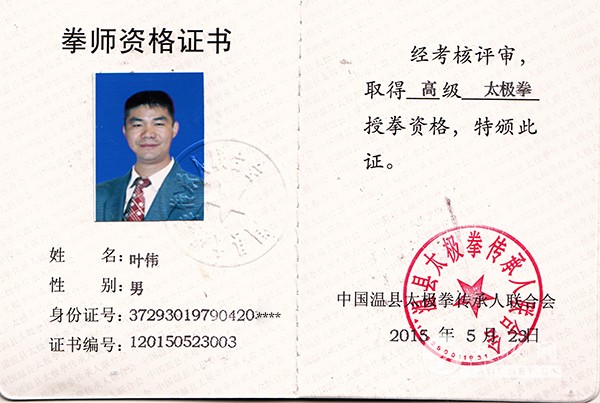 叶伟,1978年生,祖籍山东省东明县,现居住山东省淄博市。大学本科学历,曾担任山东省淄博市梓橦山武术院教练,塔山国际武术学校校长,齐鲁艺术学校校长。中国武术六段,国家一级拳师,国家一级裁判员,国家一级武士,国家一级教练员,被评为武当武林百杰,陈式太极拳一代宗师陈氏心意混元太极拳创始人冯志强先生之长女冯秀芳的入室弟子,陈式太极拳掌门人陈小旺的入室弟子。 叶伟自幼跟随民间拳师习练洪拳,93年到少林寺习练少林拳,少林单刀,达摩剑,十三枪等拳术。后到河南省散打专业队练习散打。赴泰国练习泰拳。99年到梓橦山武术院任教,任教以来培养出(张茂林,朱岗伟)等多名散打名将,多次带队参加国际•全国•山东省等历届武术比赛,并取得优异成绩,取得137枚奖牌,26个团体总分第一.向全国多个省队与多所大学培养输送上百名优秀武术人才。 2000年以来,开始习练陈式太极拳,陈式心意混元太极拳,由外家转入内家,用内家的功法养外家的功夫,使自己成为一个能打,能练,会养的武术人士。近年来叶伟专心修炼丹田弹重物和洗髓功。丹田弹重物是以练丹田气为主的功法,洗髓功是髓经的动功,本功是通过练习伸展、吐纳、吊功、拍打等方法达到生精洗髓的主要功效。精炼内外肾,用特有的工具通过外肾吊重物,用丹田气使重物荡起。经过多年的苦练,现以吊起的重量达150斤之多。 曾在国际,国内赛事中多次担任裁判长及裁判员工作,多次受邀到新加坡,泰国,印度尼西亚,马来西亚,香港,澳门等国家和地区的武术文化交流。墨西哥,美国,英国,瑞典等国家的武术爱好者慕名来中国向其学习中国武术。二十余年来培养出国内外武术人才近千名,为弘扬中华武术做出重要的贡献。 叶伟拳照 |
