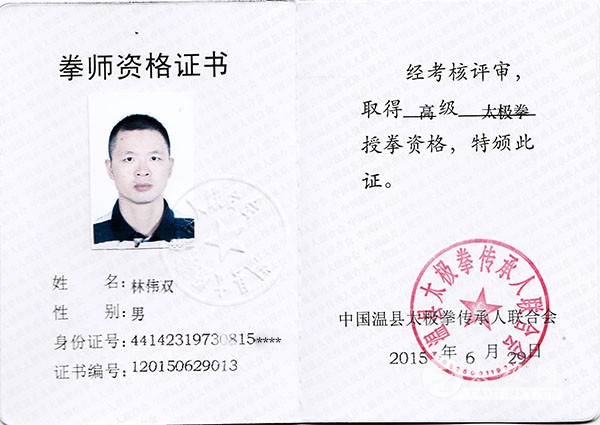 | 林伟双,男,1973年8月出生,广东省梅州市丰顺县人,梅州市太极拳协会会员。1993年9月在华南师范大学读书时开始师从太极拳大师张晓武先生练习陈式太极拳,在恩师的悉心指点下,勤学苦练,潜心研究陈氏太极拳的拳技及拳理,掌握了陈式太极拳的一些功法、理论。1994年9月论文《学太极,谈感受》在中国温县第三届国际太极拳年会理论研讨会上进行交流。2014年7月参加广东省传统武术项目锦标赛获男子成年组传统太极拳一等奖。在探索太极拳奥秘的同时,还致力于传播陈式太极拳,近年来多次代表梅州市太极拳协会参加各种交流活动,并培养了不少学生。 |