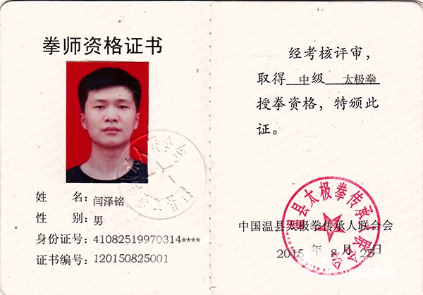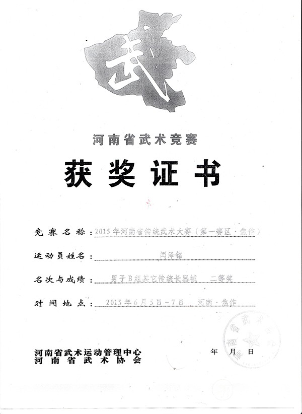 闫泽铭,男,1997年3月出生,现年18岁,温县番田镇东留石村人。自幼喜爱太极拳,师从太极拳名家,系统学习太极拳理论、五大流派套路及各类器械。由于勤学苦练,取得了优异成绩。2014年10 月,在全国武术太极拳公开赛中,获得男子少年组太极拳竞赛套路三等奖、春秋大刀三等奖,国家体育总局武术中心颁发了获奖证书。2015年6月,在河南省传统武术大赛中,获得男子传统长器械二等奖。2015 年8月,在河南省传统武术锦标赛中,荣获武式太极拳套路全省第三名,河南省武术运动管理中心、河南省武术协会颁发有获奖证书。 闫泽铭所获证书 |