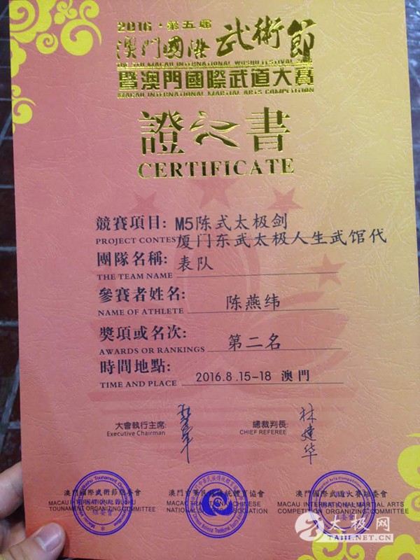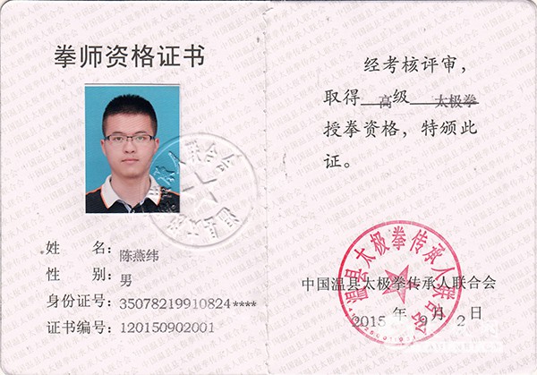 陈燕纬,字守中,福建武夷山人,现定居福建厦门,师从陈氏太极拳四大金刚之首陈小旺宗师,并得到多位太极名家指点,精通陈氏太极拳老架一、二路;新架一、二路;陈氏太极单剑、单刀、春秋大刀及陈氏太极推手。 陈氏第二十世(第十二代)太极拳传承人,陈氏第十九世(第十一代)太极拳掌门人陈小旺宗师入室弟子,中国武术协会会员,中国武术六段,厦门武术协会理事,国际太极拳冠军。 现以厦门市湖里区金山小区正我堂为传播陈氏太极拳根据地,于金山小区书香广场为教学点,传播正宗传统陈氏太极拳,创办厦门正我堂文化传播中心有限公司,并成立厦门金山正我陈氏太极拳培训中心。 陈燕纬陈氏太极春秋大刀比赛-2016年8月-前排 |