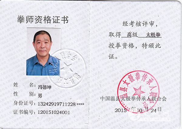 冯德坤,1970年出生于河北省保定市涞水县西营房满族村,陈氏太极拳第十二代嫡传人,孙氏形意拳、八卦掌第四代嫡传人。现任中国武术世界运动协会委员、中国武术国际高级考评师、中国国际高二级裁判员、中国民间武术家联谊会会员、黄石市太极拳研究会会长、黄石市陈氏太极拳马虹太极文化研究会会长。 从小随父习练家传八极拳,中学时期拜中国武术大师孙剑云的大弟子康群为师。习练形意拳、八卦掌及内家擒拿术。 1989年开始习练传统陈氏太极拳。1991年正式拜恩师马虹为师习练传统陈氏太极拳一路83式、二路71式、推手、功力训练、太极轮、百把气功桩、拆拳讲劲、太极拳技击法、刀、剑、杆、春秋大刀,曾多次次参加全国教练员讲习班。 1993年跟随中国主席华国锋的贴身警卫刘顺昌大师学习贴身警卫知识、射击、驾驶及一招必杀术等。 2003年参加全国第三期教练员讲习班。 2007年参加全国陈氏太极拳第七期传人讲习班。多次亲自到恩师家中让恩师给予我看拳,得到恩师的亲授。 2006年获湖北省第二届传统武术比赛,形意拳第一名、陈式太极拳第二名。 为弘扬中华传统武术,冯德坤经多方努力经湖北省体育局考核认证批准,2015年9月成立了黄石市陈氏太极拳马虹太极文化研究会、在2016年4月成立了黄石市太极拳研究会。并亲自担任两个研究会会长。 冯德坤获得陈氏太极拳传人证。是陈氏太极拳高级拳师、中国武术国际七段、中国武术国际一级教练、国家二级气功师、金刚气功教练、散打教练。 冯德坤拳照 |