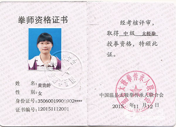 2007年 习练陈式太极拳大架一路 2008年 拜陈氏第十二代传人王大昭为师,习练陈氏太极拳小架一路、二路、108、陈氏单刀、陈氏单剑、陈氏春秋大刀、梨花枪夹白猿棍 2010年 任昆山萃华太极武术馆副馆长兼教练员,负责馆内文秘、外联工作及暑期班、日常班教学工作,培育太极新苗上百人,为陈氏太极拳小架在江南昆山发展作出应有贡献。 2010年至今 多次参加陈家沟、焦作等国内、国际太极拳大赛,摘金夺银,取得好成绩,所教学员也在各类大赛上取得骄人成绩。 拳照 |