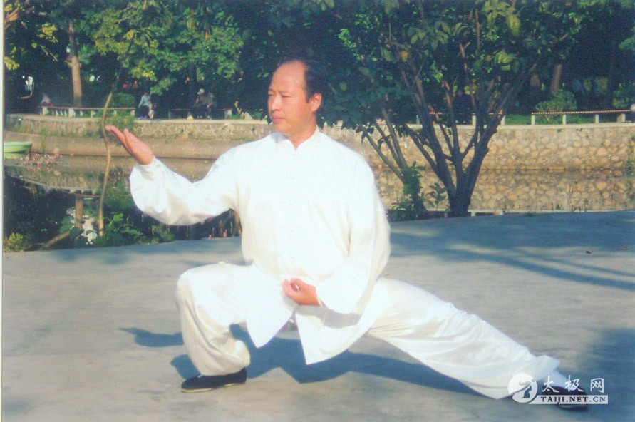 杨派太极拳前弓后蹬步细分起来有如下几种情况:一是向前打力的正弓步;二是走横的正弓步;三是身体见斜两手向前后用力的半弓步;四是走靠劲的侧弓步;五是进(上)步时的过渡弓步。这些弓步大同小异,不一一赘述。此文仅以向前打力的正弓步为倒说明。 一、站位 弓蹬步的定势,前脚掌朝正前方,后脚掌外斜45°至60°。两脚间横向距离同肩宽。即前脚的外侧沿同后脚的脚心与两肩峰的下垂点落在两条平行的直线上,习惯上把这个距离称之为“自然裆”。两脚的前后距离由练习者的出步能力所决定。前腿弓满,后腿蹬展,左右两胯横平。躯干直竖,两肩与两胯上下相合,脊柱不扭不拧。身体的重力垂线,即百会与会阴垂直到地面上的落点,在两脚间的前2/5处。也就是前脚的涌泉至后脚跟(两劲点)连线的后4/5处。 二、劲力的走行 要练好“其跟在脚,发于腿,主宰于腰,形于手指。由脚而腿而腰,总须完整一气”的走劲要领,必须处理好以下三要点。 (1)两张“腿弓”要张好。 前腿“弓满”:是指前弓腿的脚前掌至命门处这一张弓的弓背上张力要均匀一致:要达此要求,膝盖的位置就成了关键,若膝盖越过足背就会形成一张“断弓”,整个弓背会折成“三节棍”,腰力不能下达涌泉,根力也不能上达命门:上下之力只会滞留在膝间这个三角区内,形成对膝关节的强大压力和冲击力,这样不但破坏了弓蹬步周身之力的完整和通达,而且必然出现散架,练出体病,造成对膝、踝关节的损伤。 前膝的位置放在何处为好呢?杨澄甫先师讲: “膝盖不越过足背,足跗须软如棉,足心涌泉穴方能松沉踏地,”其次子杨振基老师讲:“前弓脚小腿与地面垂直,前弓的活动限度为膝盖不能越过足尖。”傅钟文先生讲:“弓步时腿的屈度以小腿垂直为准,”杨家弟子们,如崔毅士、董英杰、牛春明、李稚轩等都是这样练的。 我们可以做一个实验:弓步桩架摆好,前膝尖落到脚面根部,把右手背贴在命门处,这时你会感觉得桩架稳扎,劲力饱满。然后你有意让前膝前移,当膝盖越过足背时,你会觉得腰劲渐失,且腰椎前凹。当膝尖垂直或越过脚尖时,周身劲力的贯串就会散乱,功架也会‘懈塌、松散。所以小腿不过垂直线,膝尖落在脚面的根步,是前腿弓满、张力均匀的最佳腿位。 后腿蹬展,展的意思是直而不僵,自我感觉膝窝的肌肉不绷,若绷紧了,关节顶死,失去松弹,那就是一张“死弓”;若蹬而不展,膝关节处打了一弧,那就是一张“软弓”。软弓者不具 “发于腿”的能力,上下不能贯通,劲力走不出来。 还须明白,前后两弓的张力应该是对等的、均匀的,若出现“断弓”、 “死弓”“或“软弓”,就破坏了两弓的整体张力。 (2)劲的根点要扎准。 两脚全掌踏地,前踩后蹬,但不可满脚掌平均对待。前踩的“根儿”应该发自前脚的前掌,后蹬的“根儿”应该发自后脚的后跟。这样实中有虚的练法,才能产生出透达的根劲和“锥劲”。 (3)劲路要顺畅。 前脚掌向前下的踩劲向后上反弹,直达命门,同后撑的腰脊合为一劲;后脚跟向后下的蹬劲向前上反弹,直达尾阁,同前收的尾阁合为一劲,两劲主宰于腰。 三、操作要领 当两脚的位置站定后,在后实前虚的状态下,第一步是将身体转正,使胸向同前脚尖同向。 第二步是“腾位置”。即在身体的重心保持在后脚下不动的前提下,屈前膝使胯根松落,脚掌吃地。习惯上把这一腾位置的动作称之为“虚进前膝虚落胯”。同时裆略下沉,尾闾有前扣之意,射住前膝。 第三步是尾闾追前膝。即前膝牵着尾闾,尾闾推着盆区,推动周身使重心前移过两脚的中点。此时前脚掌已踩住劲,前膝已接近确定位置,后腿曲度变小,后脚掌承重大大减轻。 第四步是蹬脚跟。即后脚跟蹬劲,将后腿蹬直,劲力由脚跟达于尾闾,同前脚掌达命门的踩劲合二为一,顺于脊背,达于肩臂,形于手指。这种前踩达命门,后蹬达尾闾的走劲方法,对保持身弓这张主弓的弓体张力一致极为和谐。同时非常有利于走出“一个劲儿”来。这“一个劲儿”的标志是后脚跟的蹬劲必须从手的劲点上发出。后脚跟与手的劲点沟通为一条劲力直线。 以上叙述的四步动作,是找拳时的细练过程。拳找到了,练上身了,就成了瞬间之事,一蹴而就,一走全有。 |