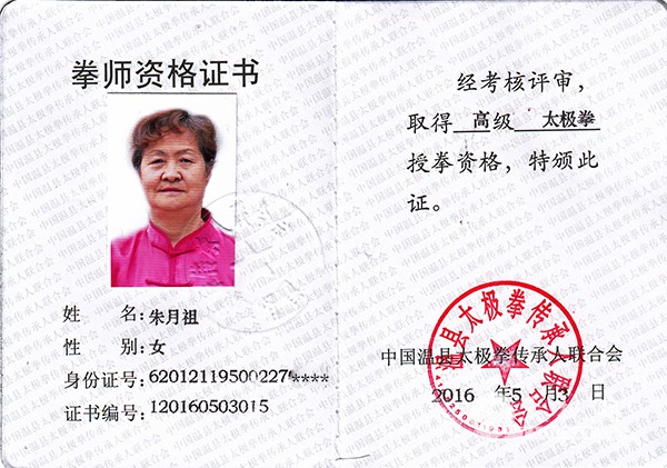 | 朱月祖,生于1950年2月,甘肃兰州人,中国武术协会会员。习武三十几年来,热爱武术事业,受家传武术熏陶,自小跟随父辈习武,在校期间曾是学校运动健将。退休后拜杨式太极拳师傅习练杨式太极拳及国家竞赛套路。2011年又拜陈式太极拳第十二代传人刘建华老师系统习练陈式太极拳、太极推手、器械等。2014年参加甘肃省武术锦标赛获武德风尚奖,2015年参加甘肃省太极拳公开赛获女子E组太极拳二等奖、太极剑二等奖,所取得的成绩都是自己努力的结果,为武术事业贡献力量。 |
