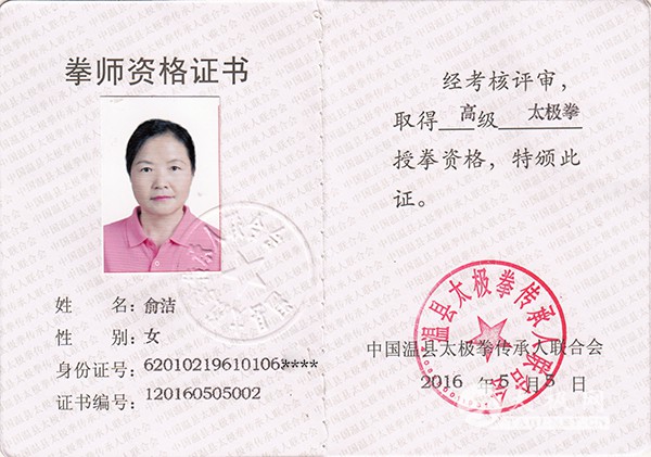 俞洁,生于1961年1月,浙江人,中国武术协会会员。习武三十多年来,拜民间拳师多名习练长拳,在校期间曾是学校运动健将。1986年习练杨式太极拳及国家统编套路。2010年跟随陈式太极拳第十二代传人刘建华老师系统习练陈式太极拳、器械等。在2015年参加甘肃省武术锦标赛获太极拳以等奖,太极剑二等奖,2015年参加甘肃省太极拳公开赛获太极拳一等奖、太极剑一等奖,2015年在中国焦作国际太极拳交流大赛获得太极拳二等奖,太极剑二等奖。 俞洁拳照 |