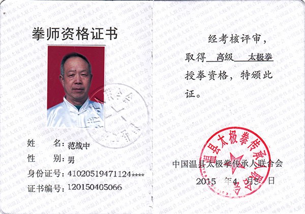 范战中,男。出生于1947年11月。范鸿信弟子。 河南省开封汽车修配厂退休职工。历任主任,体育教师汽修厂工会主席等。1981年10月在开封始从古正清老师学习杨式太极拳,24式太极拳、推手。1986年10月在开封拜范鸿信为老师习练陈式太极拳小架,新架一路、太极剑、太极单刀、太极大杆、推手等。2002年在开封参加省“武协杯”传统武术比赛获陈式太极拳优秀奖。2003年获开封市太极拳、剑、推手比赛陈式太极拳第一名。2008年获开封市太极锦标赛传统太极拳男子D组第二名。2011年被中华太极拳传承谱系编纂委员会评选为“2010’中华太极拳优秀传承人”.2000年代老师整理、编写了《关于太极拳拳理中一些问题之释述》上册(内部资料)。(此册有老师赠送入门弟子)