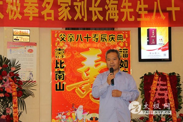 2016年 5月15日,在西安的大明宫唐御苑酒店,举行太极拳名家,刘长海先生的八十大寿。 刘长海先生,艺名陈德常。生于1937年4月12日。祖籍河南鲁山,现定居陕西西安。与1964年,开始习练陈氏太极拳。后师从陈氏太极拳四大金刚之一,国际太极拳大师----陈正雷老师,习练陈氏太极拳一路和二路。 习拳五十年来,恪守陈门武德规要,胸怀宽广无私,谨遵教,苦练功,钻研拳术之精妙,熟识陈氏太极推手和陈门兵器。深得老师喜爱,在1996年,被陈正雷大师正式收为入门弟子,2011年,晋升为入室弟子。 刘老先生现在以桃李满天下,门下得意弟子众多。 2008年,由先生发起组建,得到陈正雷大师的大力支持和同意,创建了《西安陈正雷太极拳研习会》,使陈正雷拳架在西安发扬光大 ,先生功不可没,培养了一大批优秀学生 。刘长海老师一生学习太极拳,传承太极拳,是我辈武术人学习的榜样。 我能认识刘长海老师,是老师门下一个优秀的学生兴隆,他告知我,他的老师要过八十大寿了,请我务必参加,来过后,熟知刘老师一生为传承太极,无私奉献的精神,深深的感染了我。 今天到会为刘老师祝寿的还有, 我的恩师,李树发先生, 太极拳名家 :王胜利老师 西安市武协副主席 :方秀敏 先生 西安市武协副主席:刘永强先生 西安陈子明太极拳研究会秘书长:张继伟先生 秦腔名家宋尚华先生之女:宋春莉女士 还有很多的太极拳名家及刘老师的同门师兄弟都来到了宴会现场,为刘老师祝寿。 宴会开始后,大家齐唱生日歌,家人并准备了两个大蛋糕,刘老师许愿后,满脸洋溢着喜悦的心情,和家人一起吹灭了生日蜡烛。 宴会中 ,很多的祝贺单位,为刘老师的八十大寿带来了书法作品,著名书法家张正兴先生,专门以刘老师的名字,书写了一幅书法作品,很是精妙。 刘老师的弟子们,也做了太极拳表演,以答谢老师传拳之恩。秦腔名门之后宋春莉女士,也现场清唱了两段秦腔,为老师祝寿。 整个祝寿宴会,在一片祥和的气氛中进行。。。。。。 但在会后,我想了很多,刘老师一生传拳,为弘扬太极,做出了巨大贡献,绝对是我们这些武术人学习的楷模。一个老人,五十年学拳传拳,清雅生活,淡泊人生的精神状态,不就是我们现在这一代武术人所追求的吗?我此刻心里油然的升起对刘老师的敬佩之情。 刘长海老师和来参加祝寿的来宾合影。 刘长海老师和来参加祝寿的嘉宾合影 刘老师和他的家人合影 刘长海老师和他的弟子们合影 西安武协副主席-----刘永强先生致辞 著名书法家张正兴,为刘长海老师赠送书法作品 刘长海老师的弟子兴隆,为刘老师祝寿送的书法作品。 刘长海老师八十大寿的寿桃。 各界人士,为刘老师祝寿。 书法家张正兴,给兴隆先生送的书法作品。 本文撰稿人,张勇刚和刘老师合影。 |