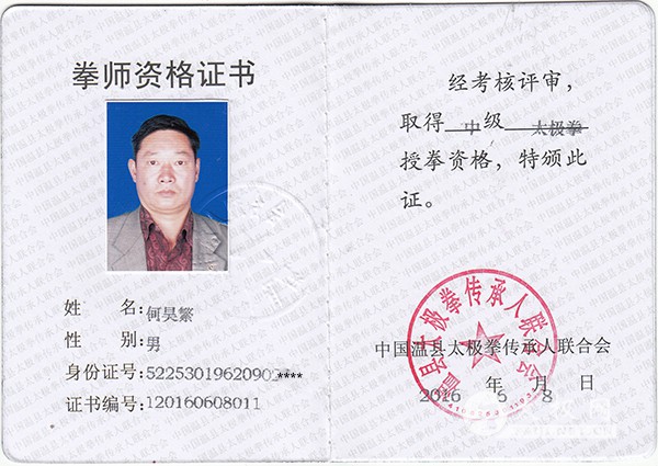 二00七年随武双线老师学习杨氏太极拳:二十四式、三十二式、四十式、四十二式、四十二式太极剑。 2011年拜云南曲靖辉煌太极研究会黄辉老师学练陈氏太极拳:陈氏四式、陈氏十三式、陈氏十八式、陈氏二十二式、陈氏四十三式、陈氏式56式、陈氏式老架二路、老架一路、陈氏式24太极扇、陈氏式单刀、太极球。 2O15年8月任辉煌太极研究会红果分会助教至今。 |