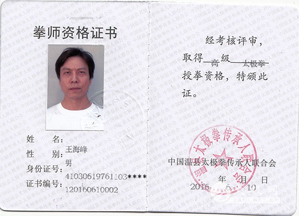 王海峰,男,汉族,大专学历,1976年11月出生,河南省洛阳市吉利区人,现在洛阳三隆安装检修有限公司仪表专业任职。陈氏太极拳第二十一世、十三代传人。2011年5月师承陈氏太极拳第二十世、十二代传人程元富习练陈氏太极拳、械。在习练太极拳、械过程中,勤学苦练,谦虚上进,为人忠厚,尊敬师友,时刻树立“四心”(决心、信心、耐心、恒心),以弘扬太极文化,承传传统太极风格,以传播传统太极文化为己任,受到了人们的好评。 2015年8月20日参加第八届中国焦作国际太极拳交流大赛在男子C组陈氏太极剑及陈氏综合太极拳个人比赛项目中荣获二、三等奖。自2014年至今在洛阳市河阳太极养生馆独立完成太极拳教学任务。 |