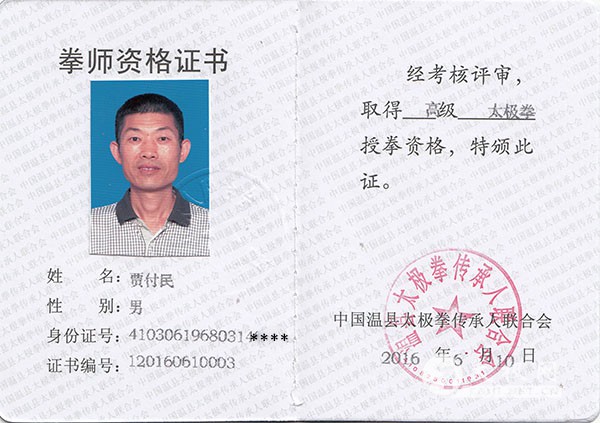 贾付民,男,河南商丘人,1968年3月出生,2003年接触太极,2009年初到陈家沟国际太极院学习老架一路,2009年12月师从程元富系统学习陈式太极拳老架一路、老架二路、陈氏太极三十八式,四十九式太极剑及太极推手等拳、械。 2015年8月20日参加第八届中国焦作国际太极拳交流大赛在男子D组陈氏太极剑及陈老架一路太极拳个人比赛项目分别中荣获三等奖。自2014年至今在洛阳市河阳太极养生馆独立完成太极拳教学任务。 |
