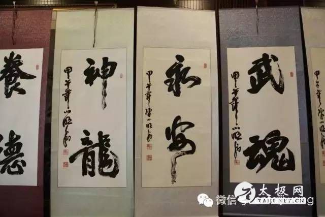 陈小旺大师书法展 书法创作,讲究笔画优美,结构严谨,笔画匀称,章法布局。起一笔决定这个字的大小、位置的偏正,第一个字决定了全篇的风格布局。存乎一心,运用自如。笔画强调有“力”。“力”是书法的内在精神,刚而非石、柔而非泥,要笔实而墨沉,忌笔飘而墨浮。要笔到墨到,墨到之处,皆有笔在。 打拳好比书法创作,举手动足好比一笔一画,一个拳式的优劣,好比一个字的好坏。一趟拳演练好比完成一篇书法作品,在幽美的环境里练一两遍或几遍太极拳,如同创作一幅满意的条幅或长卷。 初学太极拳,以示范为榜样,一招一式地模仿,犹如小学生一笔一画地学写字。拳式由手眼身法步组成,好比书法由点、直、横、勾,撇,捺等结字。 书法一般以每个汉字为基本单位,尽管字与字笔画繁简悬殊,结构纷杂多变,但都不脱离间架结构的基本规律。间架好,就能使字体端正稳健;结构好,就能使字有气势。打完一趟好拳,与写了一篇完美的书法作品,所表现的美好意境是一样的。 以意引气 / 内外兼修 太极拳与书法的健身功能也是相通相近的。太极拳是静功,是内功。先是练体,其次是练气,最后是练神。太极拳与书法是天然的气功,不求自得。在此基础上练神,则是更上一层楼。太极拳与书法,都非常注重心法,要求心神贯注,心领身为。太极拳手有定法,步有活规。古拳论提出“先在心,后在身”“意气君来骨肉臣”。古书家也强调“意在笔先,笔居心后”。可见意在太极拳与书法中的重要性。