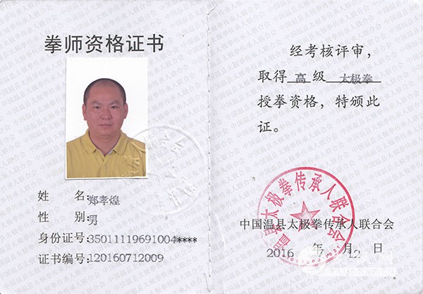 郑孝煌:福州市人,男汉,族,1969年10月出生,乡镇干部,2000年学习福州民间拳术,2005年学习太极拳,2013年拜国际太极拳大师陈有则为师,为陈氏太极拳第十三代传承人,擅长陈氏老架一, 二路,太极球,太极剑,多次参加国际赛事成绩优秀 |