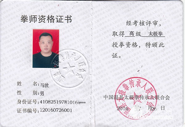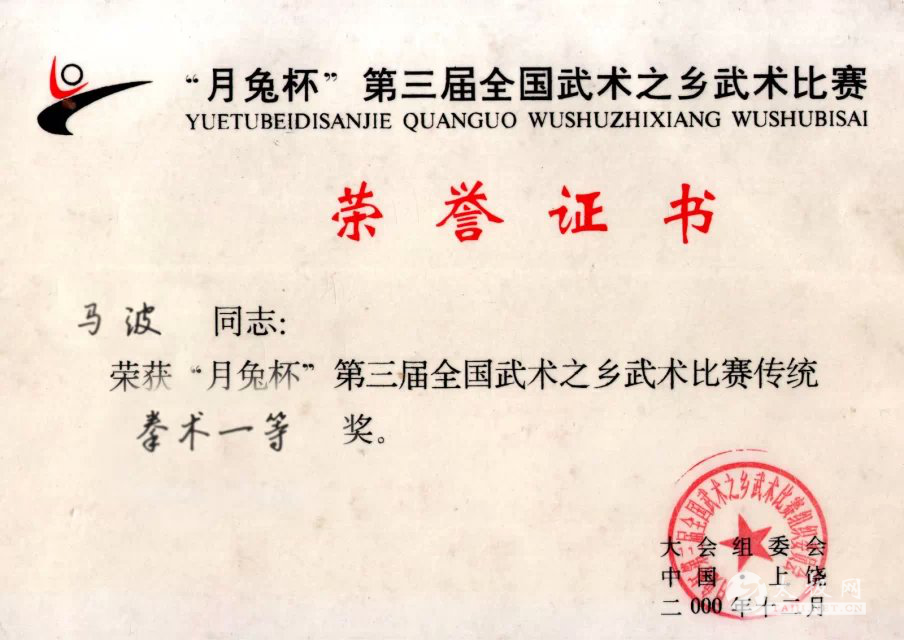马波,男,汉族,河南温县人,当代太极拳名家,国际太极拳文化传播大使,中国武术段位指导、考评员,国家一级裁判,一级武士,中国武术协会会员,河南省陈氏太极拳协会理事,温县陈式太极拳研究会高级教练。自幼随父习练家传武术,后跟张东武、徐勤兰老师系统习练各种少林拳术,经老师推荐由少林著名大师‘素法’老师亲自受教。随后系统习练陈氏传统太极拳各种套路及器械、推手。尤擅长擒拿走化及推手、散手技击。 1996年和陈正雷、张东武老师参加全国武术精英邀请赛,获太极拳、剑金奖并获得“武林新秀”称号。同年跟随张东武老师接受中央电视台采访。 1997年获温县陈式太极拳研究会首届邀请擂台赛75公斤级推手冠军。 1998年获上海市武馆院校精英搏击赛70公斤散手冠军。同年国际太极拳年会A组75公斤级冠军。获“擂主”称号。 2000年获河南省太极拳剑推手锦标赛80公斤级冠军。同年获山东“兰陵杯”全国武术比赛太极拳金奖。 2002年陕西省太极拳交汇大赛太极拳金奖,太极拳推散手80公斤级冠军。 2004年河南省太极拳、剑、推手锦标赛85公斤以上级冠军。 2006年海南省太极拳汇宗精英赛拳、剑、推手全能冠军。 2010年获香港第8届“獬豸杯”国际武术节太极拳冠军。 1996年在焦作中站院校任太极拳总教练,98年任中国银行焦作博爱分行太极拳教练,任上海市青浦龙鑫文武学校副校长兼训练部主任,太极拳总教练,1999年任广东省中山大学太极拳总教练,华南师范大学武协名誉会长兼太极拳总教练,2002年任西安市龙湖保安培训基地搏击总教练。2004年任郑州陈家沟太极拳馆训练队队长。2005年任江苏泰州市夏平武校副校长兼太极拳总教练,2006年任海南健之韵体型与搏击俱乐部太极拳总教练,同年在海南省纪委任太极拳总教练,2012年和弟马超在惠州博罗创办‘广东东武太极拳馆’,并任馆长。鉴于太极拳方面的精深造诣及在推广普及太极拳事业做出的突出贡献,2012年和‘太极十杰’张东武老师、武林大会总冠军王战军、陈自强一起被授予‘当代太极拳名家’称号。 经和李同生老师(首批国务院有特殊贡献的国家级中医骨伤科名医专家),朱鹤亭老师(国际著名养生学家食疗学家国家领导人健康顾问),易学大师沈延春老师(沈氏玄空学创始人沈竹礽嫡孙)商议于2015年9月在道教名山罗浮山成立惠州罗浮辛可太极健康管理有限公司,致力于太极文化的传播及健康之道的推广。 |