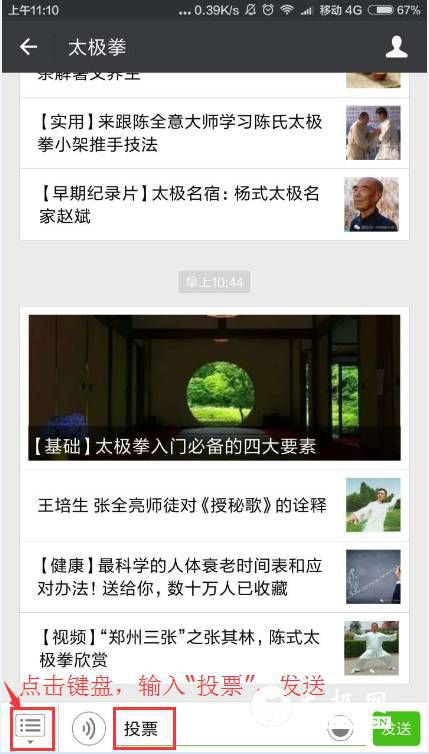 第一次进行投票时 记得一定要在下方键盘输入 “投票” ,这是为了让您的手机进入投票系统,第一次投票成功之后,以后就可以直接打开自己的展播页面,直接投票啦~~ 二、具体投票方法如下,看图指导更易懂哦。 方法1:进入“太极拳”公众号后,在下方输入框中输入“投票”,即弹出大赛页面。