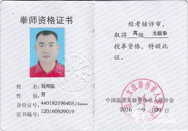 刘邦振,医学科班研究生毕业,自幼好武,投笔从戎二十二载,精通祖国医学阴阳经络学说,历任军队、地方医院院长,喜欢练习太极多年,曾发表多篇医疗论文,曾获得国家司法部优秀论文奖,曾被广州市委市政府授予“劳动模范”称号。2013年有缘拜陈家沟陈氏十九世太极拳嫡宗传人、太极拳“八大天王”之一陈志强为师。经陈志强师父悉心指导、传授心法,学得正宗陈氏太极拳架,熟练掌握老架、新架、竞赛、剑、刀、枪、春秋大刀等套路及推手、技击技巧。 2015年8月参加广东省传统武术项目锦标赛,获得:陈氏传统太极拳一等奖、传统短器械(太极剑)二等奖、传统长器械(春秋大刀)二等奖。 2015年10月参加全国武术太极拳公开赛,获得:陈氏太极拳一等奖,陈式太极春秋大刀二等奖。 2016年5月参加广东省清远市“顺盈杯”太极拳精英赛,获得:陈氏太极梨花枪加白猿棍金奖,陈氏太极拳老架二路银奖。 2016年8月获得广州市武术学会贰级教练员证书。 |