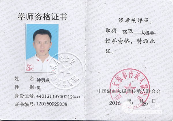 钟勇威,师承陈氏十九世太极拳嫡宗传人陈志强大师。广州市花都人、现任广州市公安局花都分局战训大队陈氏太极拳总教练。国家武术二级裁判、国家武术二级教练、武术四段、国家社会体育指导员。2016年第六届国际太极拳康大会获集体项目陈氏太极拳银牌、陈氏太极拳铜牌、陈氏太极剑铜牌。 拳照 |