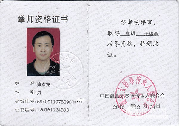 康彦龙,男,1975年9月出生新疆奎屯市人,本人从小喜爱武术、2008年6月起跟随陈氏太极拳第十二代传承人,当代太极拳名家,中国河南焦作陈照奎拳术研究会副会长、新疆分会会长,新疆奎屯市武术协会、太极拳协会副主席刘兴旺师傅,学习陈氏传统太极拳老架一路、二路,新架一路、二路,国际竞赛套路、太极剑、太极推手擒拿以及八极拳、翻子拳等,并已拜师成为陈氏太极拳第十三代传承人。 拳照 |
