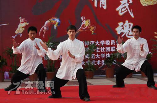 南京师范大学日前举办首届大学生武术节。 该校紫金校区的“李小龙武术协会”学生们献上一场别开生面的双截棍表演。两位来自法国和俄罗斯的朋友表演了太极拳。虽然练习太极的时间并不长可是太极的“听劲”、“引化合发”在他们的掤、捋、挤、按、采、挒、肘、靠中也能表现的有模有样,台下不断爆发出大学生们的叫好声。 来自南京师范大学社团联合会的大学生表示:中国武术不仅仅是传达了一种武术精神,从深层次来讲,它更是传达了一种中华名族精神。