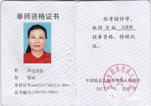 王良娟,女,1962年12月出生,广东省汕头市潮南区陈店镇人,从业中医。2001年开始自学杨式太极拳,并先后向多位老师学习杨式太极拳。中华文化,医武共理,王良娟拳术进步迅猛,从2006年开始给慕名前来的太极拳爱好者教授拳术。2011年有幸认识了国家武术七段王希富老师,开始跟随他研习陈式太极拳、器械,得恩师悉心指点,拳理精进,功力大增。经王希富老师推荐,现已成为陈式太极拳十二代传人。并取得了温县太极拳研究院研究员证;取得了高级太极拳师证。 王良娟重视以比赛促练习,以交流促提高,多次参加国际国内比赛,均取得优异成绩。2012年参加厦门国际武术大赛,获得陈式综合太极拳银牌、陈式太极剑铜牌;2012年下半年参加南少林在泉州举办的国际武术大赛,获得陈式太极剑、陈式综合太极拳、长穗太极剑金牌;2013年参加新加坡国际武术大赛,获得陈式太极拳、综合太极拳、陈氏太极剑金牌;2016年参加山东省太极拳国际比赛,获得陈氏太极拳、陈氏太极剑金牌。2017年5月参加太极.禅苑组织的陈式太极拳八式、二十四式学习,获得结业证书。2017年7月参加“首届粤港澳陈式太极精英赛”中,荣获女子中年组器械、太极拳二等奖。2017年9月18日在“2017香港回归祖国二十周年庆典演出大奖赛”活动中荣获“十佳武者”。 在不断提高自身拳艺的同时,王良娟还一如既往做好太极拳推广普及工作,投身全民健身活动,现受聘为普宁(粤东)陈式太极拳协会副会长兼教练、粤东王西安拳法分会副会长兼教练。王西安拳法研究会深圳市宝安区推广中心宝安太极养身馆特聘教练。 |