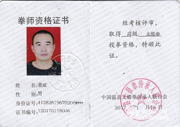 曹威,1990年习武于少林寺王占洋武术馆,2008年拜王希富为师习武陈式太极,普宁(粤东)陈式太极拳协会助理教练,粤东(普宁)王西安拳法研究会助理教练。