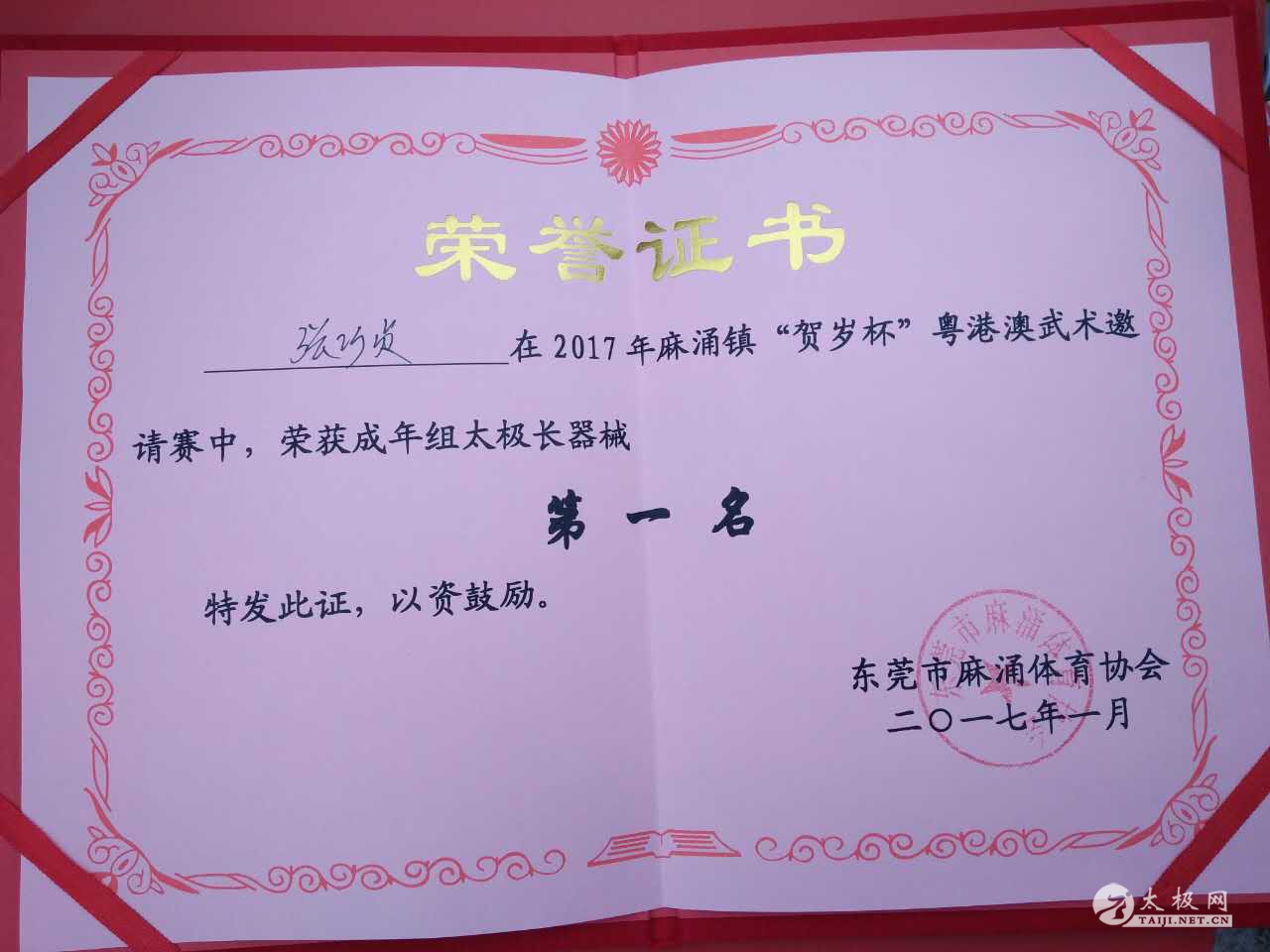 | (太极网报道)2017年1月29日,在今天刚刚结束的粤港澳武术邀请赛中,东莞长安鸿信太极馆参赛队员又获佳绩! 张巧贞荣誉证书 东莞长安鸿信太极馆总教练张巧贞获得第一名。 卢兴隆 陈式太极拳第12代传承人卢兴隆获第二名。 陈式太极拳第12代传承人黄锦锡获第4名。 赛后,鸿信太极馆荣誉馆长范鸿信大师发来贺电,张辉馆长对获奖人员进行了表彰和奖励,表扬她们给拳馆争得了荣誉,并希望以后取得更好的成绩。 责任编辑:太极网小田 |