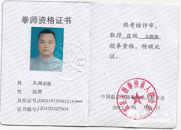周志强,世界陈小旺太极拳总会合肥分会秘书长,合肥太极缘养生馆教务主任兼总教练,浙江海宁许村太极拳协会副会长兼教务主任,浙江余杭分会副会长。中国武术六段,陈小旺大师入室弟子、陈式太极拳第十二代传承人,习武多年,佛教居士,参研佛法,佛武一体,拳架中正安舒,发力松活弹抖,教学风格幽默有趣。 2016年,参加第二届国际太极拳网络视频大赛,一举斩获陈式太极拳一等奖!并凭借在视频大赛上引人瞩目的表现及其在合肥乃至安徽地区及浙江海宁一带传播推广太极拳的杰出成就,国际太极拳网络视频大赛组委会与温县太极拳传承人联合会共同授予他2016年度“最美太极人”荣誉称号! 国家二级裁判 合肥市武协教练员及社会体育指导员 第六届世界传统武术锦标赛陈式太极拳一等奖 香港第十二届国际武术节陈式太极剑第一名 香港第十二届国际武术节陈式太极拳第一名 2016年第二届国际太极拳网络视频大赛一等奖 2016年度最美太极人 |