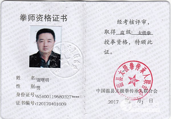 谢曙明,1968年出生于奎屯市,中共党员,农业水利工程大专,从小喜爱武术运动。 2007年跟随陈氏太极拳第十二代传承人,国际太极拳教练、太极拳高级拳师,国家武术六段,现任中国河南焦作陈照奎拳术研究会新疆分会副会长,新疆奎屯市杨式太极拳协会副会长慕富才师傅学习传统陈氏老架一路、二路,新架一路、二路,太极剑,太极刀,太极推手、擒拿,以及杨式太极拳、剑,和太极拳竞赛套路,外家拳长拳,大洪拳等。并拜师成为陈氏太极拳第十三代传承人。 |