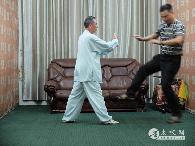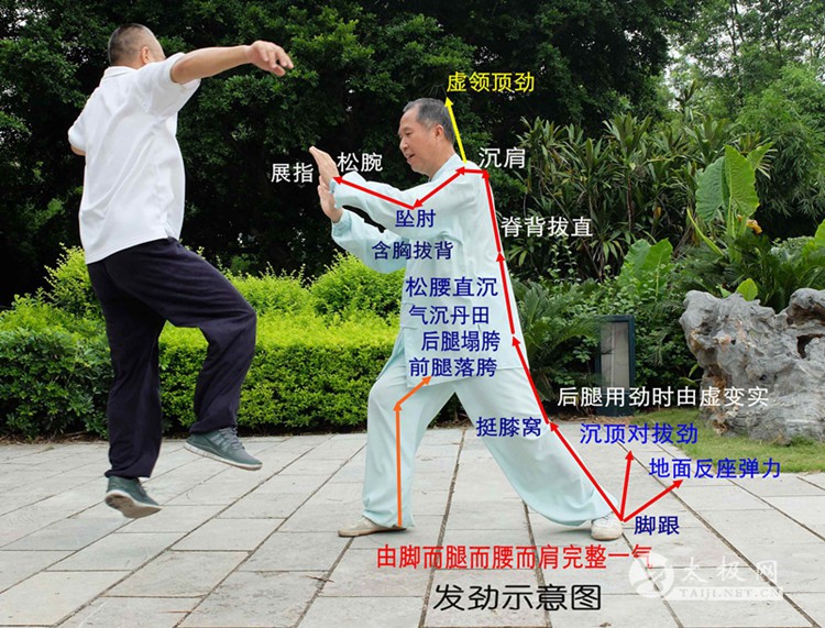 符家昌在《太极拳究竟如何发劲?》文中说:“有人认为,太极发劲应起于脚,用脚发劲,传达到手,说的容易,但真实做起来,‘脚劲达手’没几人成功的,勉强做出来也是生硬的,离太极思想太远。有人认为发于腰,依据是一腰比十手大,从体积角度去推断功理的正确性,这又显得太书呆气了,现实中,以腰发劲的人不在少数,但没有达到太极拳的要求,生硬,斗死力,零乱,比比皆是。有人认为用胯发劲,依据是张三丰拳论里一句话‘有不得机得势处,身便散乱,其病必于腰腿求之’,这些书生出身的练家,自以为比别人多读几本死书,就自高自大创造性地认为,张三丰的拳论里,被人别有用心地省去了一个‘间’字,‘其病必于腰腿求之’其实不是指腰腿,是指腰腿间,就是胯部,于是自作主张认为,一定是以胯为动力源,力量必从胯中发出,并从老论中寻找有关‘太极胯’的理论以支持自己,可是,当他用胯发劲应付对手时,也一样被人逼得手忙脚乱,乱顶乱扯,太极拳之淡静神态变成村夫打架。”现实中确有不少太极拳爱好者和一些拳师都没能准确理解认识太极拳发劲,所以发起劲来不脆不整,不够太极味。 学练太极拳的发劲,我认为首先要理解认识“发劲时,起之于脚,行之于腿,蹬之于膝,主宰于腰,形于手指,灵通于背,发于脊背,神贯于顶,流通于气,运用于掌指,达之于神。”和“由脚而腿而腰总须完整一气”这两句经典拳论,把整体发劲搞清楚,那就是不能把脚、膝、腿、胯、腰、脊、肩、手分开的,分开就不完整了。倘若没有膝的松开挺拔,则力难达于脚底,发劲到对方身上无甚穿透力,所以少了膝的有效运动就不完整。倘若没有腰的松、直、沉,就不能做到力达四梢、气鼓全身、劲从脊背发出,所以少了腰的有效运动也不完整。丹田劲是腰、腹、臀、腿等部的协调爆发力,倘若没有作为重心部位的丹田冲向上下、前后、左右的爆发力,发劲也做不到完整一气。我师爷雅轩公在回忆杨澄甫宗师发劲的记录中说:“杨老师打崔立志之肘下捶,陡然一去,崔则感觉如同木塞子插进胁部去一样。”倘若没有沉肩坠肘的动作,就不能完成肩与臂的整体连通,无法使周身之劲合为一体,所以少了肩、肘的有效运动也不完整。雅轩公的在回忆杨澄甫宗师发劲的记录中说:“打董英杰之拗步掌,只见其身势一坐,掌指一动,人如触电样崩出。”可见发劲中的“沉坐”动作是一个重要环节,“沉坐”的基础是“松腰塌胯”和“松腰落胯”。半马步、弓步等步型的拳势都是应该“沉坐”的。从网上视频中看见一些名师所谓的发劲根本没有“沉坐”之势,甚至发劲的瞬间臀部与后脚都提起、前移了,这样的发劲就不够整了。发劲的松沉还有一个重要环节是两肩之“沉”,发劲如果没有两肩之“沉”,由下向上传递的力量也是不可能传递到手臂的。 发劲动作的身体反应次序很难准确地表述,大致的说法可参考太极拳明师魏坤梁在《我对太极拳发劲的体悟》文中所述:“在‘顶头悬’的前提下全身放松、沉坐、撑脊,从而将小腹的力量(附注:我理解为内气内力)往下送,引起脚蹬地,同时依赖放松、沉坐、撑脊、拔背、沉肩、顶劲、不转腰、不动手(附注:我理解为不用手的拙力),将始于脚往上传递的力量(附注:我理解为沉顶对拔劲和地面反座弹力)波浪形地传递到手发放出去。” 我的一些弟子提问:“有些太极拳名师坐在凳上脚离地怎么能发劲呢?”据报道太极拳名师董虎岭晚年因糖尿病而腿部截肢坐在轮椅上,半闭双眼,显得油灯耗尽,当听说来访的媒体记者黄建成想要与他动手体验一下太极拳功夫,立刻来了精神,他一个发劲将黄建成打出丈远。相传太极拳名家李经悟晚年手术后腿脚不便,仍于坐椅上也能展示推手功夫,坐在轮椅上与弟子推手,还能发放不是弟子,有个弟子去看他,他说“我老了,不中用了,连一篮子鸡蛋都提不动了,但是,如果人给我作用力,我还是可以利用内功引化发放”。我恩师林墨根在病逝前十几天,九十岁高龄了还能坐在医院床上与不少弟子推手发放,他老人家发劲到了精彩处开心笑起来。有位前辈说:“太极拳的内功,一旦有了,终生不退,这是内家拳的独到之处。”坐在椅上或床上照样能松腰塌胯、气沉丹田、沉肩坠肘、含胸拔背、完整一气的发劲,其中重在腰脊的松、直、沉功夫;不过没了腿脚与地面贯通,还是有差别的,能发人出去,得借助自身较强的内功了。 太极拳要能够发出较强的劲和较好的功效,得知道与哪几个因素有关。一是用意识协调脚、腿、腰、肩的能力,以意导形,以形催劲;我认为在“由脚而腿而腰总须完整一气”加上含胸拔背、沉肩坠肘就会更好的完整到位。杨澄甫宗师说“能拔背则力由脊发,力大无穷矣”,这样能使下盘更为稳固,而且能增强发劲的效果。拳谚“肩垂则气力到肘,肘垂则气力到手”反映了肩、肘在力量传递过程中发生了支点、积蓄与转换的杠杆作用。二是发劲的神经反应的协调性与神经传导的速度。三是精神安静的神意配合层次,“发劲须沉着松净,专注一方”,发劲才会又脆又快又准。四是与听劲和引劲有正比关系,发人时如无引劲,只能用拔根之法使对方失重跌出,这有点犯顶抗之病,属于初级阶段的发劲;发人时如含引劲,引之中对方已经落空,无根可拔,那是技在擎,属于中级阶段的发劲。五是本身有一定的体重,对发劲技艺水平相同的人来说,体重比较大
