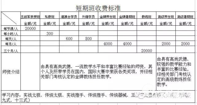 王战军太极学校视频简介 王战军太极学校位于太极拳发源地河南温县陈家沟。由中国太极拳新一代领军人物,“王战军太极”品牌创始人、“常胜将军”王战军先生创办并担任校长和总教练。 学校占地面积30000平方米、配套设施完善、师资力量雄厚、全年招收6至20岁左右长期班学生以及各年龄段的短期班学员。在太极名家王战军先生的带领下,我们正朝着成为“中国太极拳职业教练员培训基地”的目标不断前进。 自1996年建校以来,王战军太极学校已经培养出数十名全国武术冠军,在央视“武林大会、武林风、峨眉传奇”等大型赛事中屡夺佳绩,荣获奖牌12180余枚,其中金牌4000多枚;多年来,学校努力培养热爱太极文化并希望将太极拳作为自己职业技能的学生。作为一所太极拳特色学校,我校还增设了文化课程,文武双全、德才兼备是我们的教学方针。 随着大健康产业的发展,太极拳职业教练员已成为当今一项热门职业,由王战军先生亲力打造的“教练培养班”也于2014年正式开班,旨在培养太极拳职业教练员。我们倡导:习拳者、徳为先;善武者、和为贵。希望将学生培养成德才兼备、拥有从业资格和技能的太极拳专业人才。同时,学校还与武汉体育大学开展联合办学,从而实现了我校教练培养班的毕业生可以同时拥有:国家承认的大专文凭、王战军太极职业教练员认证证书以及参加“王战军太极”这个平台遍布国内外十几个国家、八十多个发达城市的外派教练员培训机会,在理论与实践相结合的教学模式中,坐拥“中国太极拳职业教练员培训基地”—王战军太极学校独有的社会实践平台,为学生将来从校园走向社会搭建直通桥梁。成绩优秀者,还能获得“王战军太极”在全国及世界各地分会、养生会所或推广中心以及加盟合作企业的就业机会。只要你努力!就能成为我们“王战军太极”的推广人,就有机会参与分享我们的发展硕果!未来,我校“教练培养班”毕业生定将成为“大健康产业”中养生领域的“抢手人才”。 收费标准 长期班收费标准(全日制) 开设课程 文化课教学设置 我校的文化课教学分为三个学部:小学部﹑中学部与中专部。所设学科与国家教学大纲同步,并结合生源的实际情况开设特色学科,学生毕业后均颁发国家承认学历的毕业证书。 小学部:开设语文、数学、英语、品德、写字、社会等课程。以开发小学生天赋兴趣的为主,采用多种形式的教学方式相结合,寓教于乐,学生们在学好文化课的同时,接受中国传统太极文化的启蒙教育。 初中部:开设语文、数学、英语、品德、历史、地理等科目(物理、化学、生物等为选修科目),并增加特色学科:书法、写字等课程。以关注青春期孩子的心理健康成长为主,因材施教,学生们接受文武双修的学习理念,在勤习武艺的同时内修文化。 中专部:开设语文、数学、英语、政治等课程。在此基础上增设特色课程:太极拳理论、高考特训。以关注学生树立正确的人生观与价值观为主,注重学生的品德培养,为学生步入社会奠定良好的基础。 武术课教学设置 王战军先生把其二十余年来所积累总结习练太极和赛场夺冠的心得和经验与团队悉心教研,并结合吸取其他武学的特长,研磨出一套系统完善的武术教学大纲。武术专业课程设置为:武术基本功、太极拳套路(包括器械套路)、太极推手、实战太极。四门课均以我校的教学大纲(年级任务)指导教学。 名师出名校,学校一直致力于教练员的培养,由王战军先生和外聘的优秀太极拳老师定期为本校教练员授课,并制定了一套严格科学完善的教练员培养、考核、选拔制度。学校教练员分三个的等级:高级教练、金牌教练、特级教练。学校武术课分:高级班(由高级教练教学)、金牌班(由金牌教练教学)。 针对全日制在校学生开设如下课程: 小学部:以基本功为主,另设置套路、推手和实战课程。 初中部:以基本功和套路为重点教学,开设推手实战课程。 中专部:根据学生特点,开设国家规定和自选竞赛套路(含各种器械),兼学其他流派之精华(如杨氏、吴氏、武式、孙氏等)。以推手和实战为重点教学,在熟练掌握传统太极拳套路的基础上,把太极拳推手、太极拳散手中的招式、技巧巧妙运用到实战中去,实现传统太极拳与实战太极有机结合,相辅相成。学生获得国家二级运动员证,可为将来考入高等学府奠定良好基础。 全日制武术课程: (一)太极拳套路: 1、传统套路:主要学习太极拳传统套路及器械。 2、国家竞赛套路:主要学习国家规定的竞赛套路和自选套路。 (二)实战太极: 特色教学模块。主要学习实战太极基本技术、攻防实战技术和格斗对抗技术。 (三)太极推手: 主要学习太极推手的核心技术,把太极拳中的掤、捋、挤、按、採、挒、肘、靠与推手技术相融合,通过专业训练,方可达到“由著熟渐悟懂劲”的境界。 (四)健身养生班: 主要学习王战军太极系列拳法:王战军太极十三式﹑王战军太极三式﹑王战军太极六式﹑王战军太极九式等,以达到调节身体机能、修身养性、延年益寿的目的。 (五)短训班: 适应于太极拳业余爱好者、专业教练或在职工作人员的短期培训,以提高其专业水平和身体素质。根据需求,可选择学习太极拳传统套路和器械,也可选择学习其它对抗性专业项目。 (六)青少年寒暑假班: 以学习武术基本功和太极拳套路为主,兼学实战太极,是针