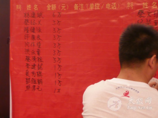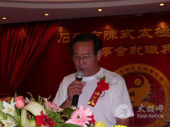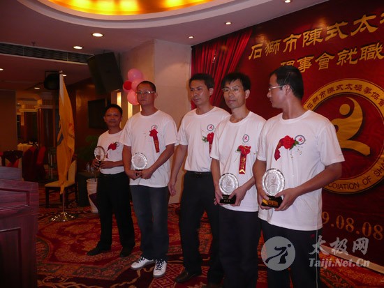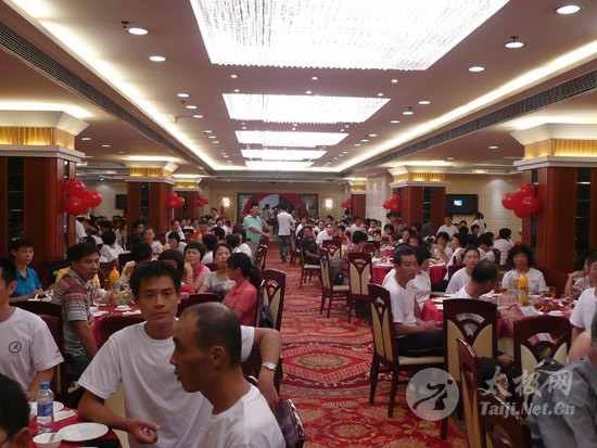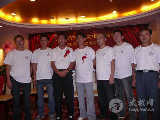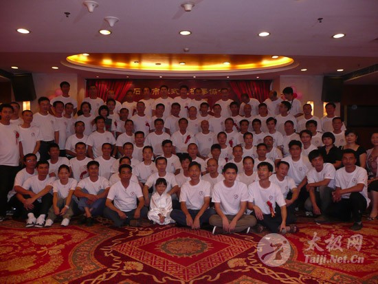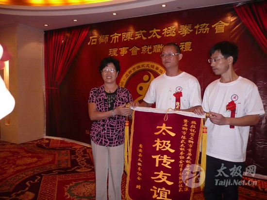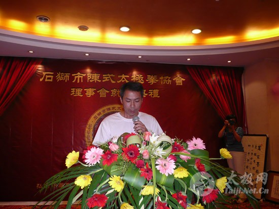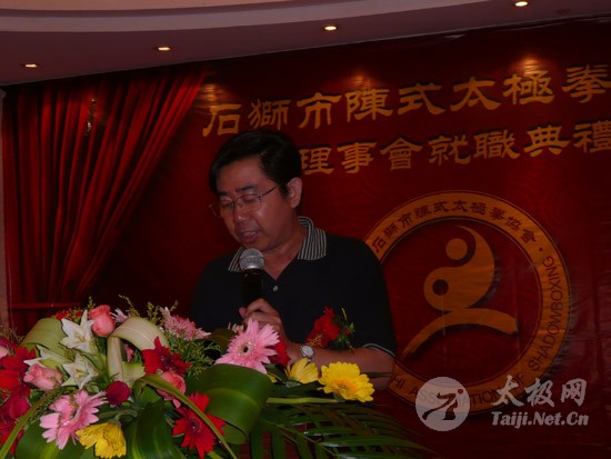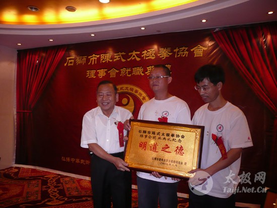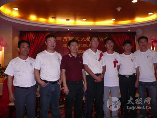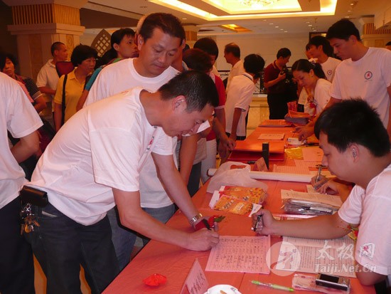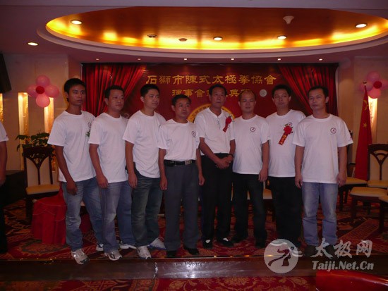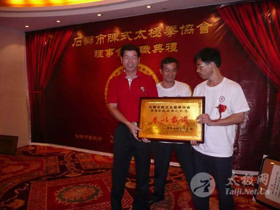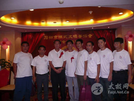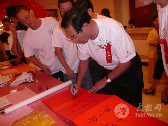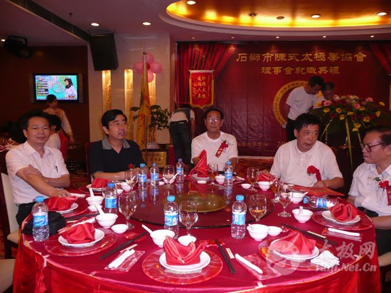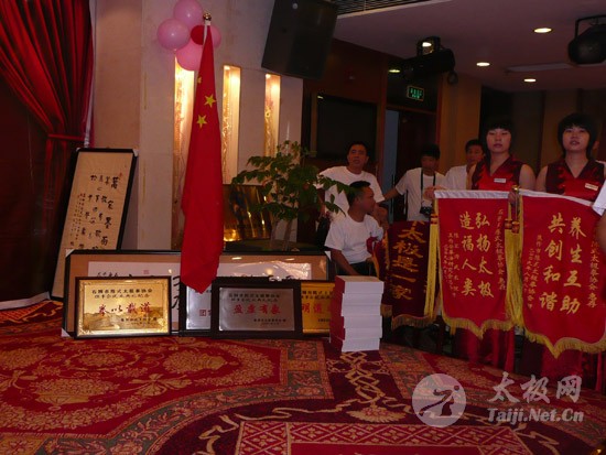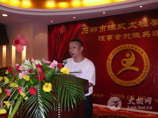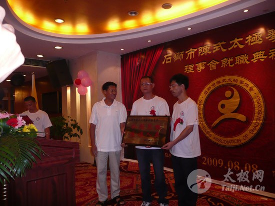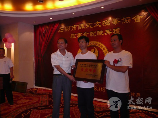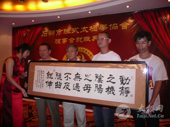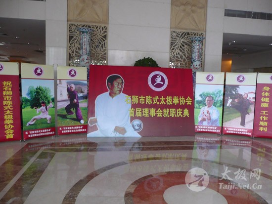 2009年8月7号,石狮市和周边的太极拳爱好者关注着两件事,这两件事可以用“风起云涌”“太极拳”来形容:一是今年以来最大的台风“莫拉克”会不会在8月8号在福建沿海一带登陆,影响明天石狮市陈式太极拳协会组织的“庆祝全国首个全民健身日太极拳观摩表演赛”,二是如何参加于明天举行的“石狮市陈式太极拳协会理事会就职仪式”。 8月8号,全市因防抗“莫拉克”台风,所有单位人员处于一级戒备状态。虽然原定的在石狮市陈式太极拳协会理事会就职典礼期间,由本协会组织的“庆祝全国首个全民健身日太极拳观摩表演赛”因市里取消了所有大型活动而停止了。但协会理事会的就职典礼仍然异常热闹。 8号上午8时起,活动举行地豪富华大酒店,开始迎来了一批批前来参加活动的人群。楼上宴会大厅前厅,负责接待的人员忙碌而有序地做着接待登记工作,登记着前来参加活动的单位、嘉宾和为协会捐款的单位和人员。大厅里,600多名来自各地的会员和嘉宾,笑语满堂。泉州市人大副主任颜伟劲、石狮市政协主席丁家全、石狮市人大副主任吴青木和泉州市武术协会、石狮市科技体育局的领导参加了庆典仪式。 在上午举行的庆典仪式上,通过了石狮市陈式太极拳协会章程的修改意见,协会领导陈健泳介绍了协会今后的工作打算。与会的领导和嘉宾代表作了热情洋溢的讲话,大家在祝贺协会理事会就职的同时,希望他们再接再厉,取得今后工作的更大成绩。 著名国际太极拳大师王西安专程前来参加庆典仪式,代表王西安拳法研究会和陈家沟武术院向大会表示热烈地祝贺。参加活动的太极拳爱好者,大部分是王西安的弟子或再传弟子,王西安的到来,使众多的陈式太极拳弟子有了和大师零距离接触和学习的机会,登门求教者络绎不绝。作为陈式太极拳的传承人之一,王西安为大家这种热爱太极拳的精神所感动,在短短的两天时间里,王大师忙得不可开交,每天凌晨2点多才能休息。 得益于市里各级领导的支持,石狮市近年来太极拳普及发展的形势很好。石狮市太极拳组织的团结和发展,必将为推动石狮市全民健身运动的开展,构建和谐社会以及推动当地社会事业的发展起到积极的作用。  庆祝协会成立,酒店大厅布置的宣传栏