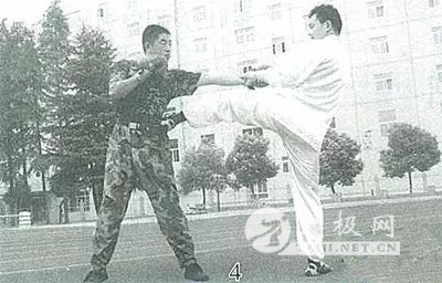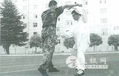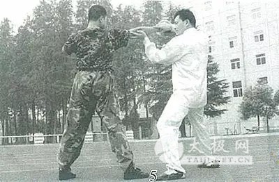 陈式太极拳起势散手技法 说起太极拳格斗,大多数人都抱有怀疑态度,也有人会嗤之以鼻。毕竟张三丰、杨无敌等英雄大侠的高深莫测的武功,我们都是从书本或武侠影视片中看到的。所以人们不免要问:既然太极拳那么厉害,怎么没见过有人用太极拳打败过散打高手?甚至更多的人宁愿相信练三年太极拳的打不过练三个月散打的。事实上,我们看到的许多情况也确实如此。其实公园里练太极拳的人,从严格意义上讲,90%的人只进行外在动作的模仿,很少有人进行内在功力的训练,更少有人进行散手训练。这样的太极拳当然就只能是十年不出门了。为了让太极拳爱好者对太极拳有一个更全面的了解,本人把家传太极拳的格斗及训练方法整理出来,供太极拳格斗爱好者参考。我们以陈式太极拳老架七十四式为例,对每个招式的运劲方法、假想敌的拳脚进攻部位及我们防守反击的时机、方法,以及太极拳打手的训练逐一剖析,使真正的太极拳大白于天下,并使大家能够用科学的方法练好太极拳,强身健体,掌握防暴自卫的最直接方法,培养我们见义勇为时最根本的信心。 中华武术,不管哪门哪派的武术,用于格斗时都要求简捷、实用,太极拳也不例外。太极拳徒手格斗时所表现出来的从容,是丰富阅历、精湛内功、纯熟技艺的自然体现。我们要经过怎样的千锤百炼才能达到天下之至柔的太极技法捷若惊鸿、快如闪电、迅如炸雷、沾连黏随、不丢不顶、后发先至的机智功力呢?让我们追本溯源,了解拳术原创的本来面貌,并坚持苦练,达到太极拳在技击方面的一招制敌。 首先我们来探讨陈式太极拳的起势动作。陈式太极拳的起势动作是在自己身心自然松静的状态下完成的,这种松静状态也可以说是一种临战前的准备状态,是身心应战前的最后调整,同时起势动作也可以随时采取进攻与防守反击。王宗岳宗师《打手歌诀》日:“掤捋挤按须认真,上下相随人难进。任他巨力来打我,牵动四两拨千斤。引进落空合即出,沾连黏随不丢顶。”在这里我们暂且把它的技击原则界定为“舍己从人、防守反击、凭机智与功力克敌”。根据这个原则我们用科学的方法、实事求是的态度,对陈式太极拳制敌方法进行深入探讨、分析研究。 粗看起来,太极拳反复多变,但仔细推敲太极拳技击八法(掤捋挤按采捌肘靠)的技击原理,确是简单、实用。在套路练习中,我暂且把起势动作分为三个阶段或者说是三种不同的运劲方法。 第一阶段 分脚、起手、下坐,我们把它理解为松静蓄气或准备作战状态。当对手突然用右拳向我面部进攻时,我通过胯转(在太极拳重心转换时几乎都是通过胯转,也就是我们常说的走裆劲)使重心移于右腿,左臂向前左掤开来拳,同时右掌跟发力击打对手腰腹部(图1)。 图1 [练习要点]本动作是起势的开始动作,也是陈式太极拳的整套动作的开始。人们常说“一年之际在于春,一天之际在于晨”,我说“套路之际在于起势”。拳谚日: “行家一伸手,便知有没有。先看一步走,再看一伸手。”这就是说作为一个武者只要你架子一摆,你的功夫高低、身手如何、是进攻型还是防守型、身上有无破绽、破绽在哪,明眼人看一眼便知。由此可见起势的重要性。所以要想练好太极拳,不论是格斗训练或者是套路练习时都要慢慢体会动作要领,体会为什么要走裆劲、不走裆劲行不行,总结出自己的经验、教训、体会之后,你就会发觉突然跃上了一个新的台阶。当然,在练习太极拳时,并不是说动作越慢越好,而是通过慢动作练习找出动作的运劲方法、内气运行的路线,体会对手向我进攻时所使用的招式以及自己应对的办法。一切了然于胸后才能刚柔相济、快慢相间、随心所欲,达到练拳无人似有人、格斗有人似无人的境界。当然要达到这种境界极不容易,一个人能战斗就已经不易,而要想以弱胜强就更加难了。所以我们还要明白这个动作的掤劲与外家拳的不同之处:当对手突然用右拳向我面部进攻时,外家拳使用这个动作时左臂主要是小臂用力挂或格挡,右手进攻,而在太极拳中左臂棚劲主要是腰部发力,用身体整体协调力拨开对手,目的是让对手失去重心,使对手身体不经意间撞向我进攻的右手,使两力相撞,产生巨大杀伤力。 第二阶段 上动不停,对手右拳一击不中,又发左拳,这时我重心移于左腿,右臂拨开来拳,左臂顺势采劲砍击对手脖颈动脉(图2)。 图2 如对手格挡,我则起右腿抽击对手左肋部(图3); 图3 如对手闪避,我则重心右移起左鞭腿抽击对手左肋或踹击胸腹部(图4)。 图4 [练习要点]本势动作主要练习自身左突右闪的整体协调能力。我本人在学习之始,也有老师讲此动作是叼托手。即对手用右拳向我进攻时我左手叼抓对手手腕,左手上托其肘(图5)。在经过多次反复练习后,这作动作做得都不成功。试想:在双方快速的击打对抗中,要想击中对手一拳或一腿都很困难,更何况是要抓住对方快速运动中的手腕。 图5 第三个阶段 当我左鞭腿或踹腿被对手格挡或闪避开时,我左腿迅速前落,左掌快速前弹以掌指撩其面或插其眼、喉等部位(图6); 图6 待对手上防我左掌时,我右脚快速向前跟进,同时右掌掌指插击对手小腹或撩击其裆部(图7)。 图7 [练习要点]本势动作主要练习上攻下随、指上打下的能力,也就是拳谱上所说“上下相随人难进”的具体实施,同时也可以理解为一种上虚下实战法或“引进落空合