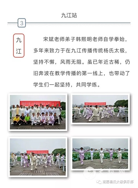 从一个人的爱好到一群人的专业 三十五年前,宋斌老师从部队转业回乡,开始接触太极拳。自幼喜武的宋老师因缘际会地了解到杨氏太极第四代嫡传杨振铎尊师就在太原定居,且常年在迎泽公园藏经楼前公开教拳。每逢周末,宋老师便乘坐将近4个小时的公交车,从汾阳前往省城跟随杨振铎老师学拳。这一学,便是将近四十年。 三十多年来,环境在变,交通在变,不变的是宋斌老师一心学艺、教拳传拳的那份初心。 国家武管中心主任高小军、山西省体育局领导在山西省杨氏太极拳协会调研。摄于迎泽公园藏经楼前。前排左三为杨振铎尊师,前排右一为杨斌老师。 宋斌老师陪同师父、师母及段英莲老师登顶泰山。 自1997年开始,时任汾阳市杨氏太极拳协会总教练的宋斌老师就开始了一年一度的大型公开义务教拳。三十年来,从无间断,每年暑假,为期一个月的传统杨氏太极拳培训班,培养了上万人次的太极拳爱好者,让数以万计的群众从中获益。真正秉承了杨振铎尊师“为全人类健康做贡献”的号召和宗旨。 南下广州、上海传拳后,宋斌老师也将这一传统带了过去,每周至少一次,在公园、广场公开义务教拳,进一步推广传播。 【图为汾阳、上海、广州的公益课】 三十多年来,宋斌老师不仅奋斗在教学第一线,大力推广、传播传统杨氏太极;更是不遗余力的培养了一大批的骨干教练和精英,无论走到哪儿,都是一支亮眼的队伍。 三十多年来,宋斌老师不断总结自己的教学经验,并结合曾在部队教导队的教导方法,不断完善着自己的教学体系。上至耄耋老人,下至黄口小儿,无论是为了强身健体,还是为了技击防身,总有一套适合你的方法。 “二三四一教学法”应运而生。 “二”指两心,一为恭敬心,即对杨家历代宗师以及老师保持恭敬心;二为尊敬心,即师生之间、同学之间互相尊重。 “三”指三德,一为公德,即遵守社会公德,遵纪守法;二为手德,不轻易与他人动手过招,对他人的展示、表演予以掌声鼓励;三为口德,不口出狂言、不辱骂他人,不轻易评价其他人、其他门派、其他拳种。 “四”包含两个三位一体相结合的教学总结:第一个三位一体指招式详解、推手应用、技击攻防三位一体相结合的教学;第二个三位一体指在招式详解的过程中通过步型步法、身型身法、手型手法三位先分开进而合为一体的学习方法。 “一”指通过对太极理论的学习和对太极技艺的实践,进一步追求精气神合一、道术合一、身心合一。 2015年-2016年,宋斌老师的“二三四一”教学法太极课程连续荣获全国高校精品课程优秀奖,适应性强、效果显著的教学方法受到了广泛的欢迎和高度的肯定。 用所有人都能听懂的方式去教授太极、传播太极,是宋斌老师及其团队多年来一直在坚持的一件事情。 从一个个人的爱好,逐步发展到一群专业教练的事业,正应了那句话“不忘初心,方得始终”。 是传承者,更是传播者 2002年,宋斌老师有幸被杨氏太极第四代嫡传人杨振铎尊师收为首批入室弟子,成为杨氏太极第五代传人。 2014年,宋斌老师在汾阳举办首次收徒仪式,有七位弟子拜入门下,最远的来自巴西。 2017年,宋斌老师在上海再次收徒,有来自江西、湖南、湖北、福建、浙江、广东、重庆、上海以及山西多地的共28位弟子拜入门下,队伍逐渐壮大。 正月期间,宋斌老师带着弟子一行前往太原拜访杨振铎尊师,向师父汇报在外工作进程以及新年的工作展望,杨振铎尊师也表示了对斌惠团队在外传播、教授传统杨氏太极工作的肯定和赞扬,并教导我们继续努力,坚持为大众服务,使杨氏太极更加繁荣昌盛,为全人类的身体健康做贡献。 看望杨振铎尊师 近年来,国家大力扶持传统文化的重新发扬光大,更是不遗余力的打造太极拳健康工程,在全国范围内进行推广。《健康中国2030规划纲要》中明确提到“重点扶持推广太极拳、健身气功等民族民俗民间传统运动项目”。 为响应国家扶持政策,响应杨振铎尊师“健康中国,太极同行”的号召,作为传承人,成长为优秀、合格的传播者,更加迫在眉睫。 三十多年来,宋斌老师始终坚守教学岗位,更是不遗余力的传播和推广。只要有平台,就去讲太极。不仅仅是讲拳、教拳,更多的是从传统艺术和文化的角度去分享和交流,吸引更多的年轻人关注、加入。一步步打造太极精品项目,树立太极品牌形象;坚持贯彻太极拳六进项目,即进学校、进社区、进乡镇、进企业、进机关、进军营,服务基层百姓。 2009年,宋斌老师应邀陪同师父师母前往美国田纳西州纳什维尔参加国际杨氏太极拳协会成立十周年庆典暨首届国际太极拳高峰论坛,受杨氏太极振铎系第五代嫡传掌门杨军老师任命,成为杨澄甫太极拳汾阳中心主管,随之在山西省汾阳市开设杨澄甫太极拳汾阳中心-汾阳斌儒堂,由此展开了在汾阳周边乃至山西的教拳步伐。 2014年,宋斌老师再次携学生前往美国肯塔基州路易斯维尔参加国际杨氏太极拳协会十五周年纪念暨第二届国际太极拳高峰论坛,回国后宋斌老师毅然决定辞去工作,南下广东开设广州斌惠堂,开始了在珠三角地区的全职化、专业化的传拳、教拳活动。 2015年,宋斌老师率弟子前往上海教拳,2016年开设上海斌惠堂,开始了在长三角以及周边地区的传拳、教拳活动。 2009年美国纳什维尔 2014年美国路易斯维尔 2017年,宋斌老师及其团队的传拳足迹更是遍布全国各地。 以上