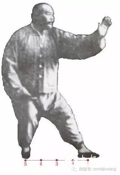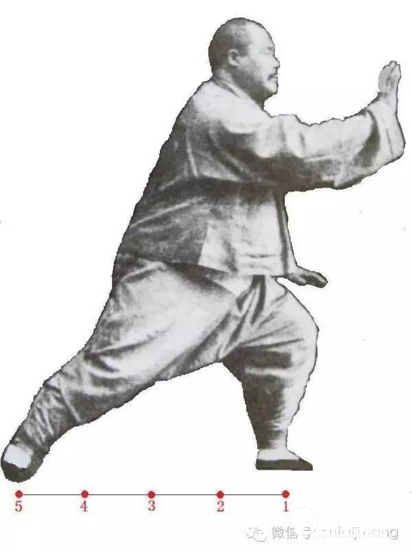 笔者从12岁开始在上海跟随太极名家董世祚学习杨式太极拳,至今已有50多个年头了。为了使更多的拳友打明白拳,真正感悟太极拳内涵。我把恩师的传授以及自己几十年习练的感悟,在此与各位老师和拳友做一交流、讨论。 练太极拳,先要明白什么叫“太极拳”。王宗岳在《太极拳论》中说:“太极者,无极而生,阴阳之母也。”开篇就道出了什么叫太极拳,“阴阳”也,即“分虚实”。 杨澄甫在《太极拳术十要》中说:“太极拳以分虚实为第一义”;在《太极拳练习谈》中说:“两腿宜分虚实,起落犹如猫行”。太极拳中的“虚实”变化包括重心的变化、内劲运用的变化等很多方面,在这里先谈重心的变化,也就是说,在行拳走架中,始终要分清虚实,在虚实的转换中完成整套拳的习练。 那如何做到虚实分清呢?也就是在行拳走架时,如何转换自己的重心位置,使支撑身体重量的两腿做到“全实”、“全虚”、“实中有虚”、“虚中有实”。 杨澄甫在《太极拳练习谈》中说:“体重移于左者,则左实,而右脚谓之虚;移于右者,则右实,而左脚谓之虚。所谓虚者,非空,其势仍未断,而留有伸缩变化之余意存焉。所谓实者,确实而已,非用劲过分,用力过猛之谓。故腿曲至垂直为准,逾此谓之过劲,身躯前扑,即失中正姿势。” 我把支撑身体重量的两腿之间分成1~5个点,也就是在行拳走架时,重心如何在这5点之间转换,做到“无过不及”。 ![]() 图(1)左手搂膝拗步